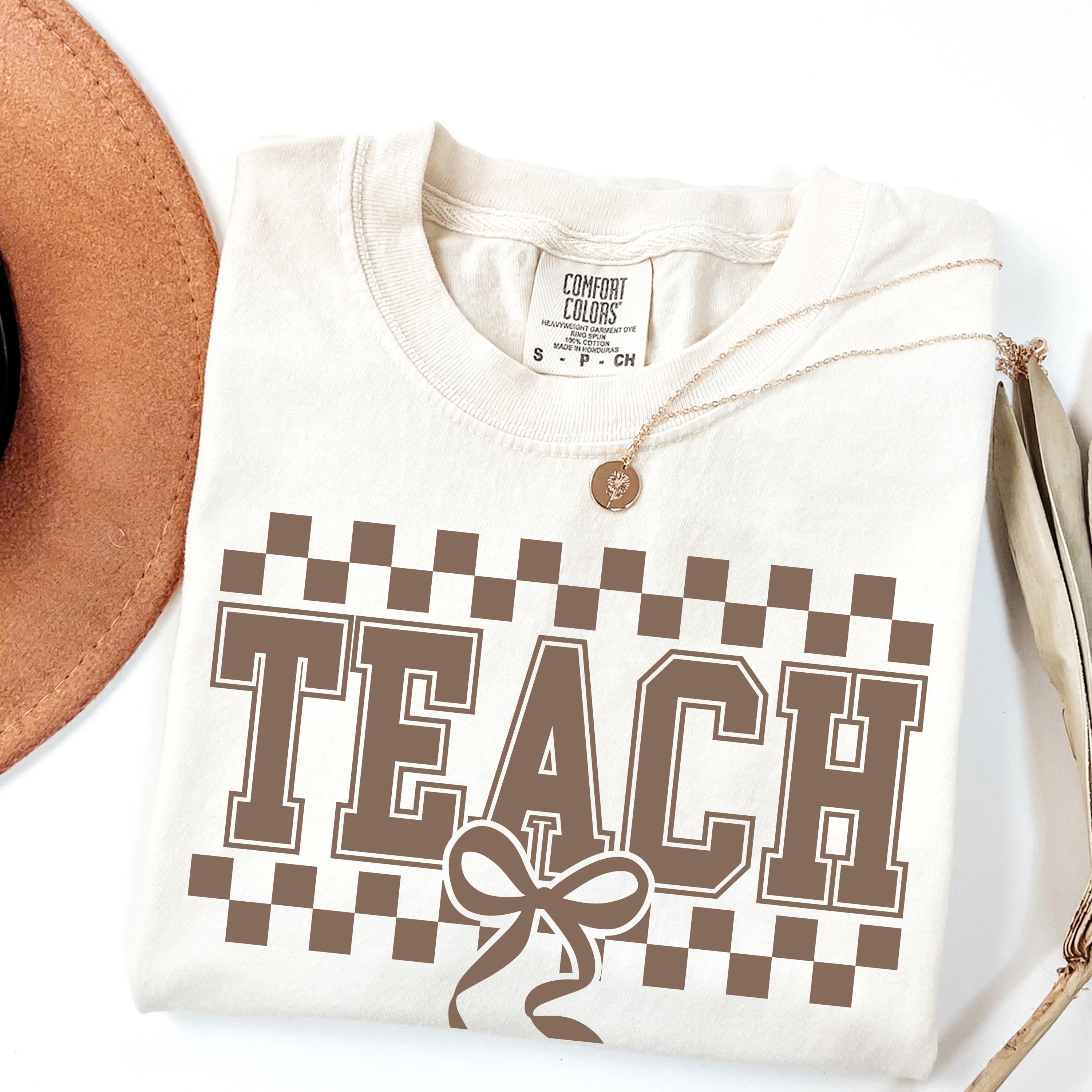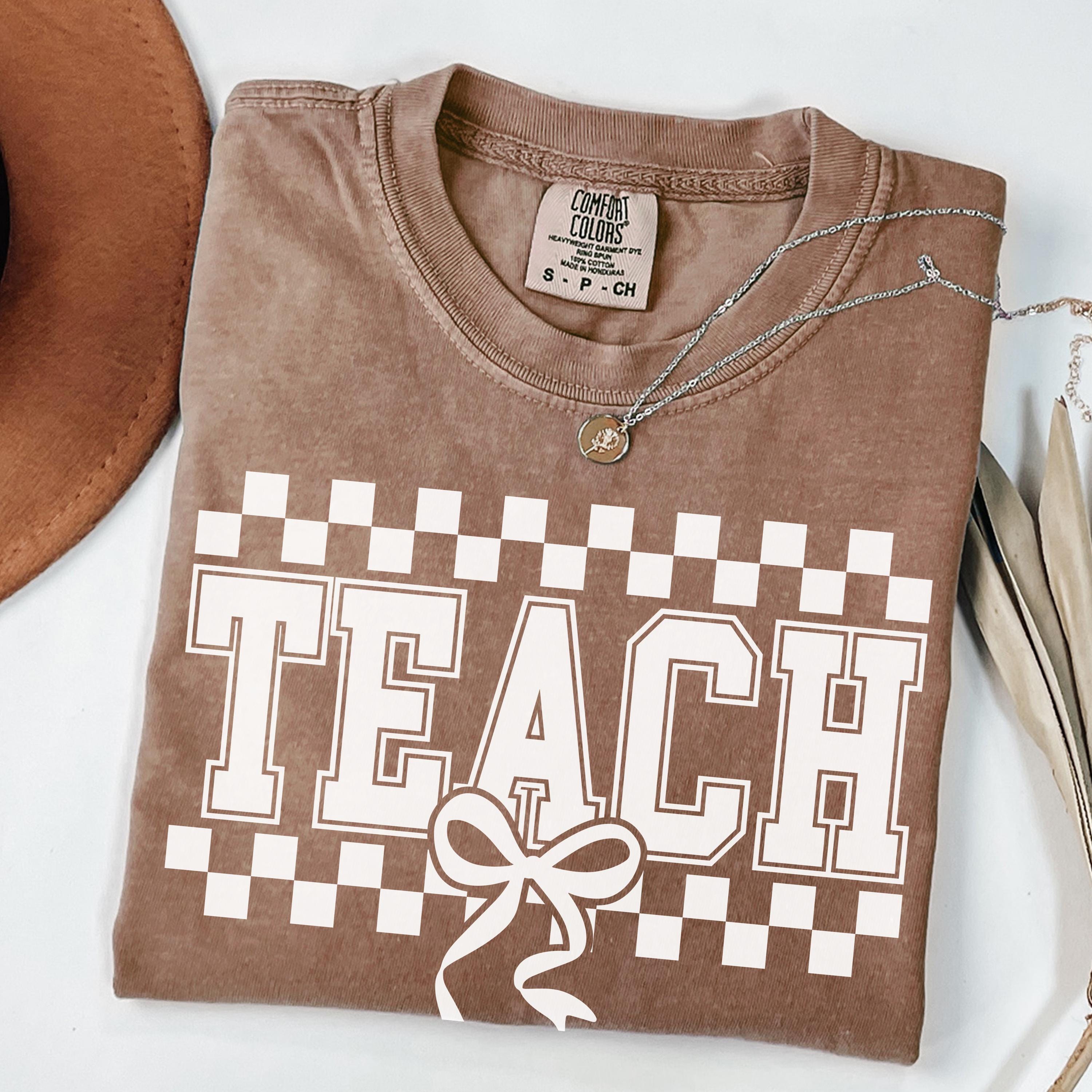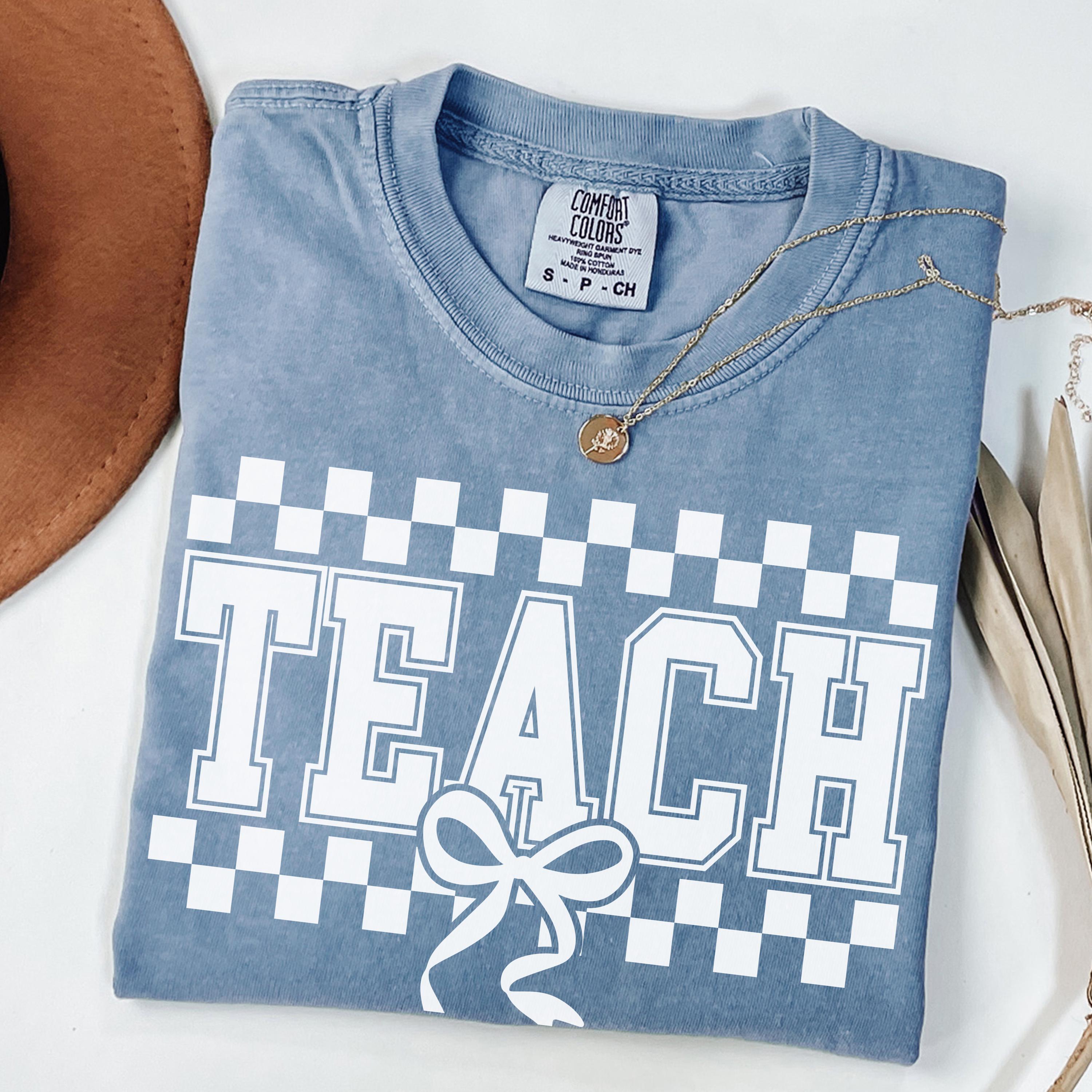 This Comfort Colors® tee features a varsity “TEACH” design with checkered pattern and a cute bow detail. A stylish and cozy shirt that's perfect for back to school, classroom outfits, or as a thoughtful teacher appreciation gift!