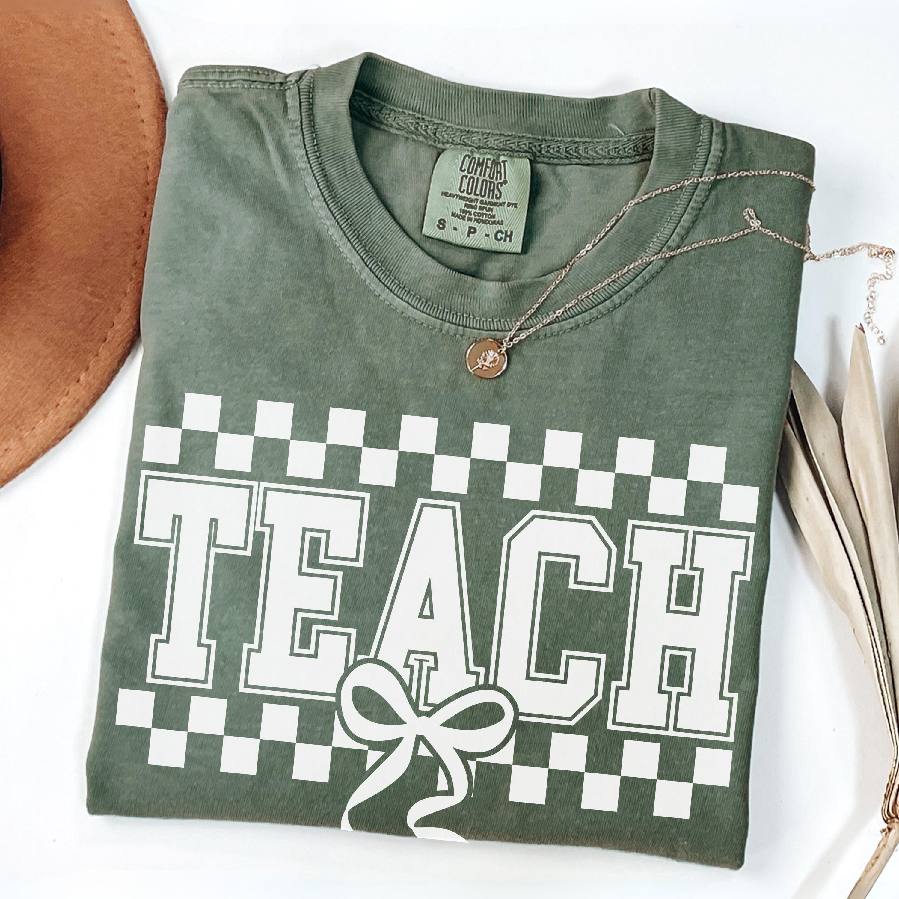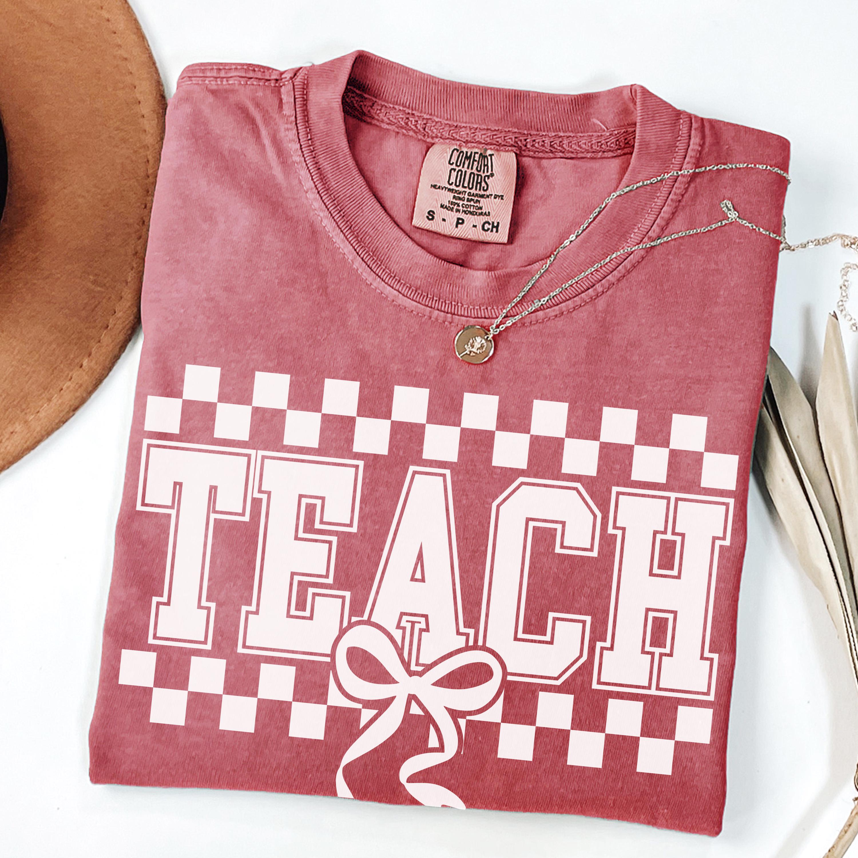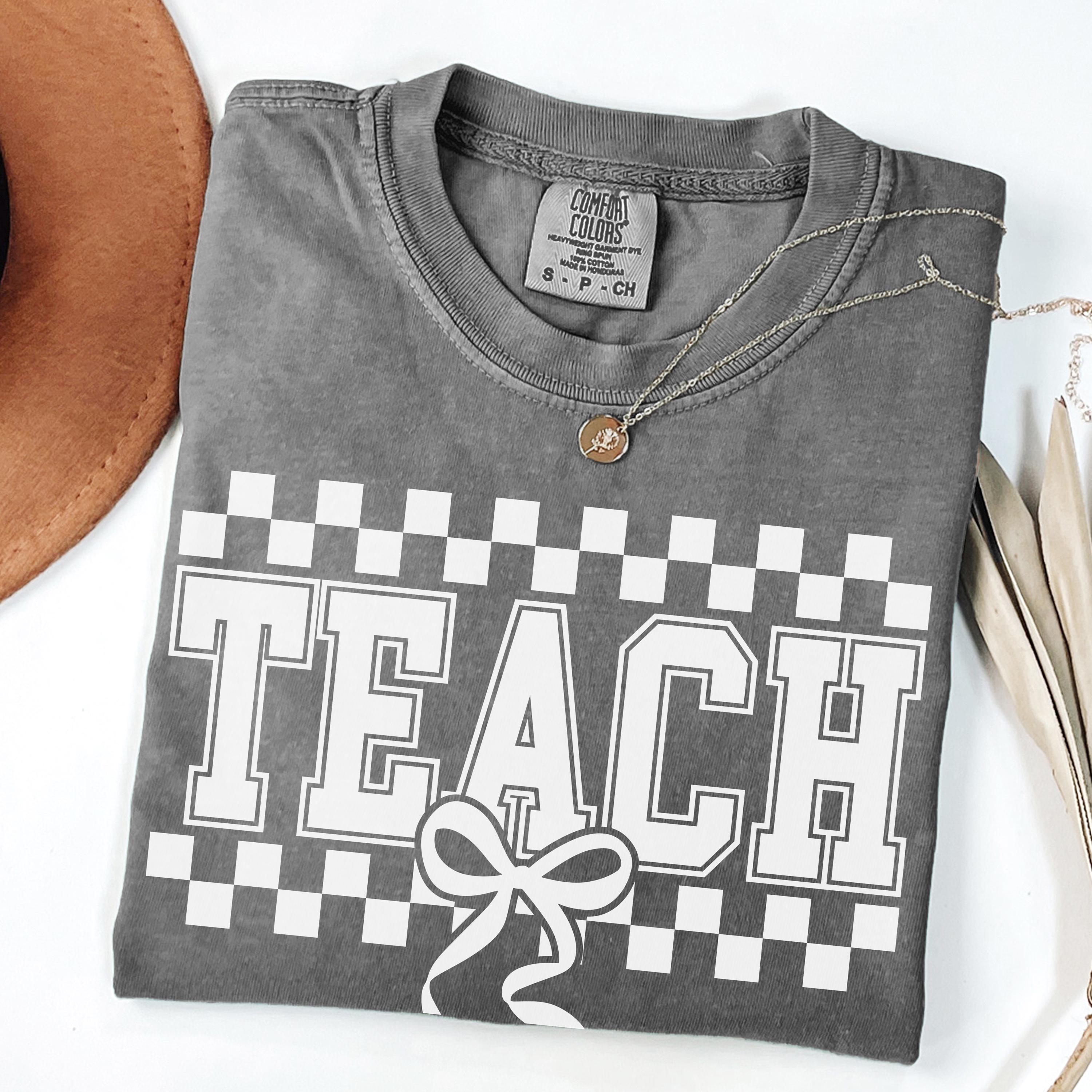 This Comfort Colors® tee features a varsity “TEACH” design with checkered pattern and a cute bow detail. A stylish and cozy shirt that's perfect for back to school, classroom outfits, or as a thoughtful teacher appreciation gift!