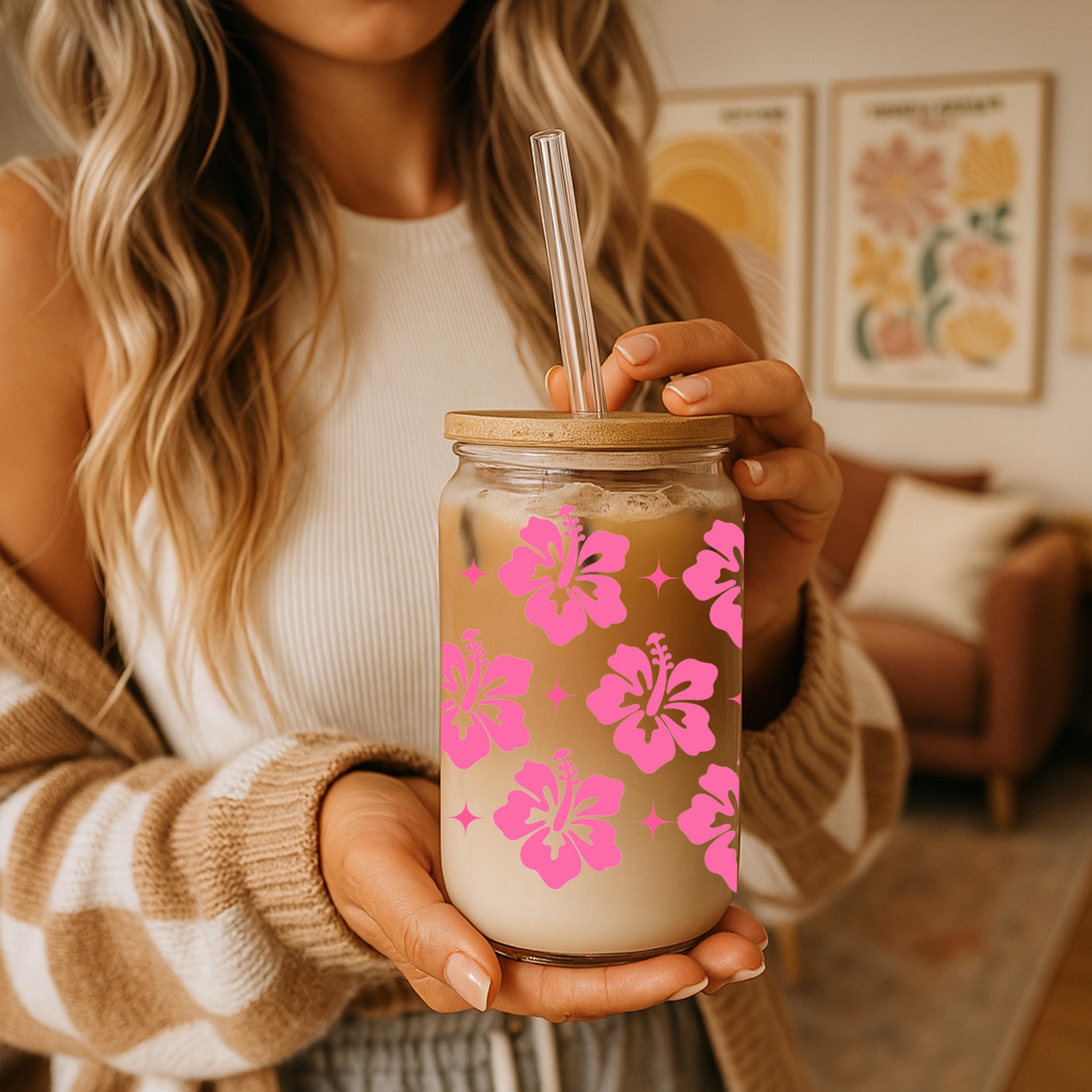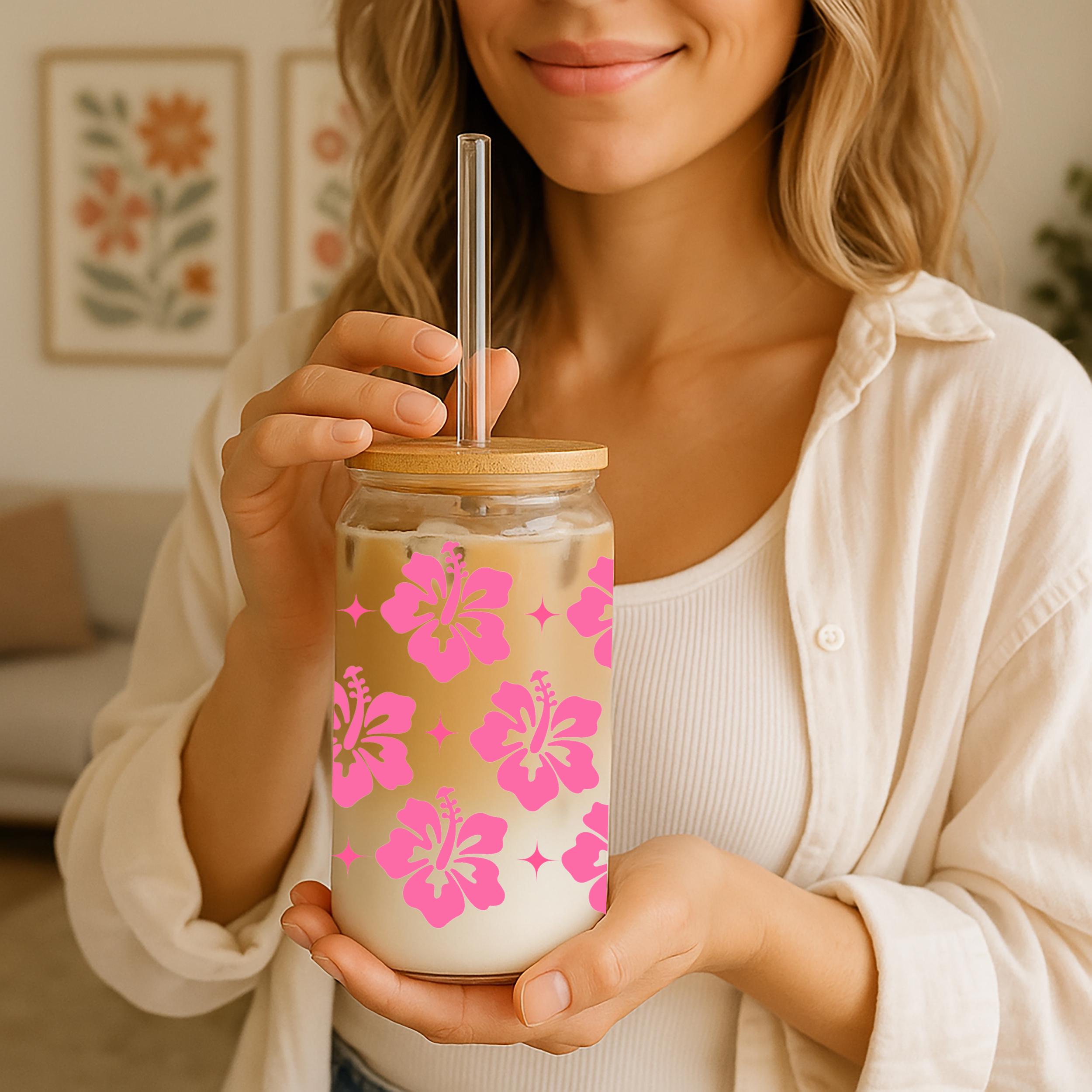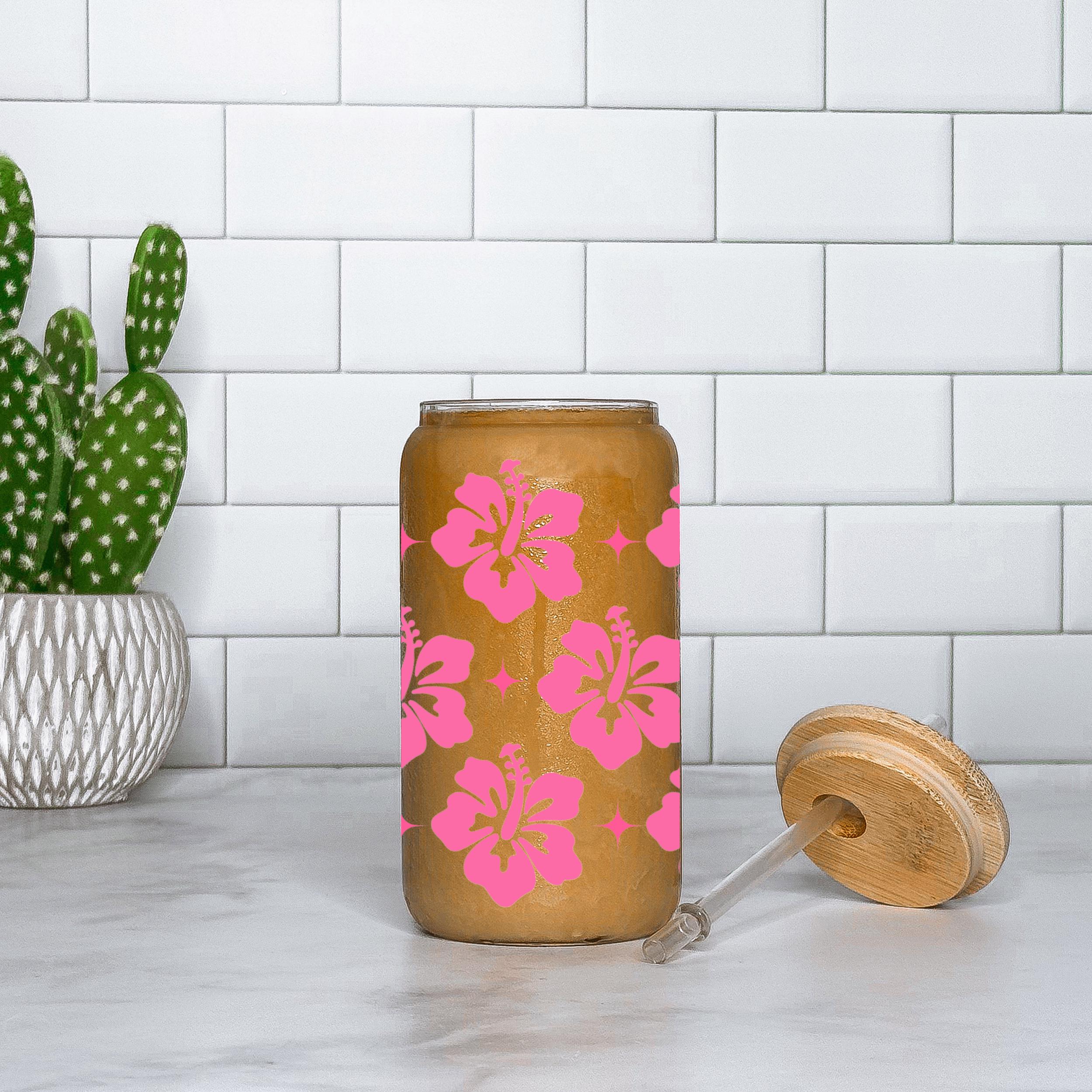 Add a tropical and feminine touch to your daily routine with this beautiful glass cup featuring a vibrant pink hibiscus flower pattern. Perfect for iced coffee, smoothies, tea, or your favorite cold drink. Comes with a natural bamboo lid and a reusable glass straw—ideal for home use or on the go.