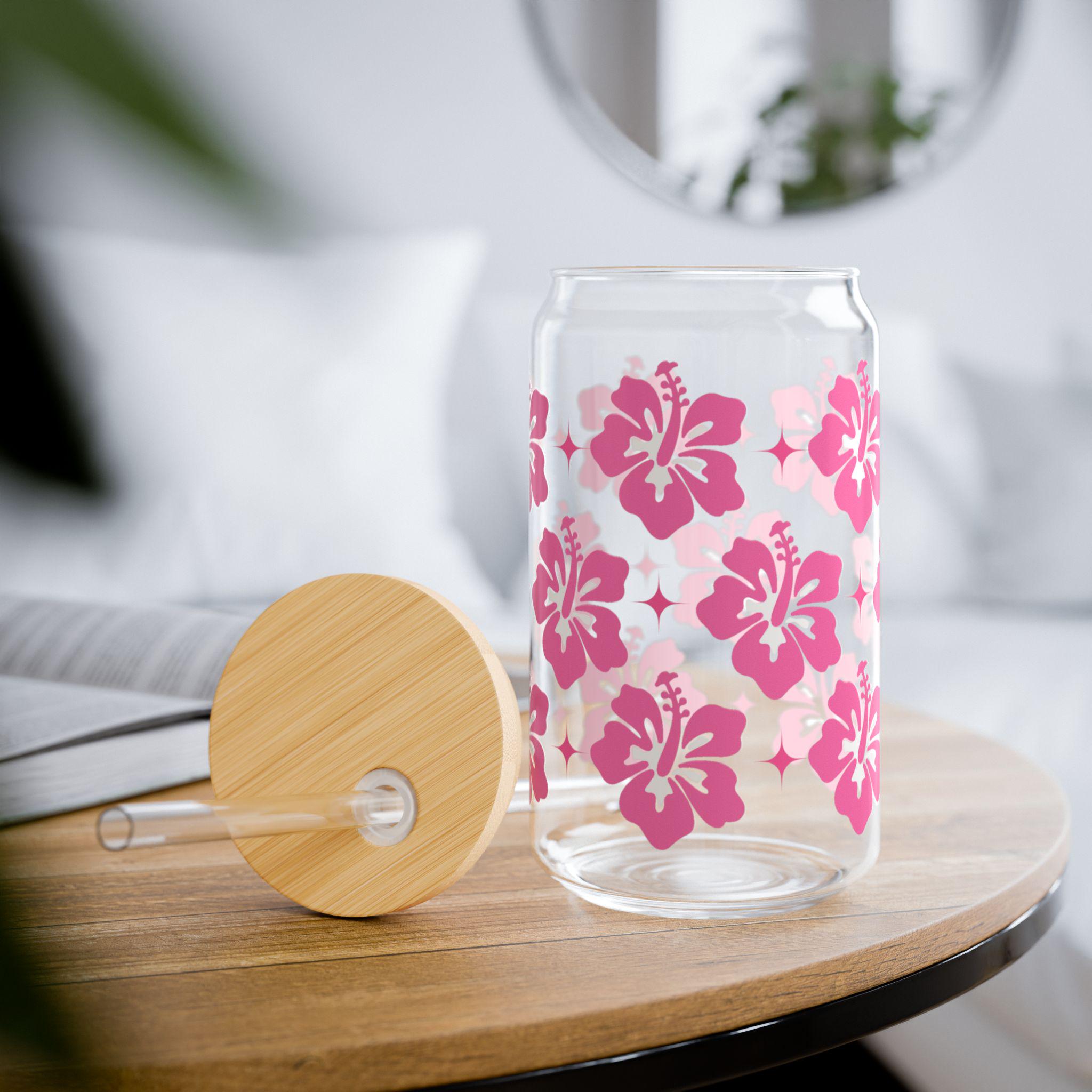 ✨ 16 oz Glass Can Cup with Pink Hibiscus Flower Design ✨