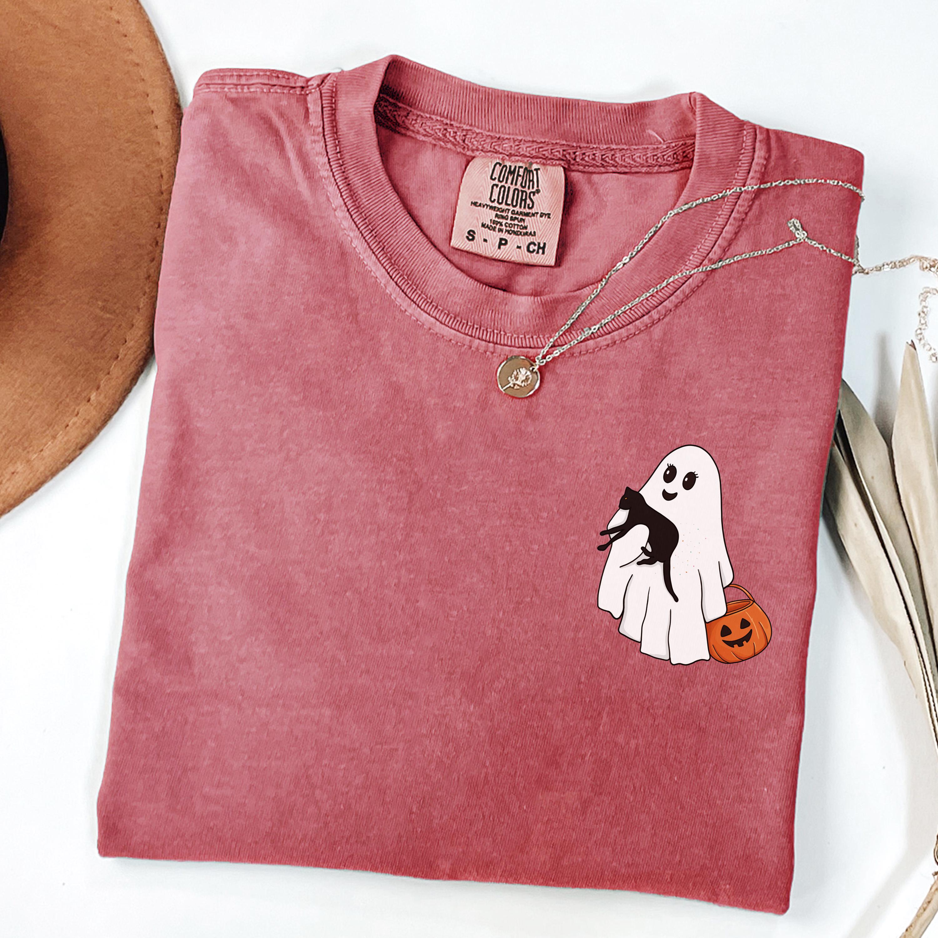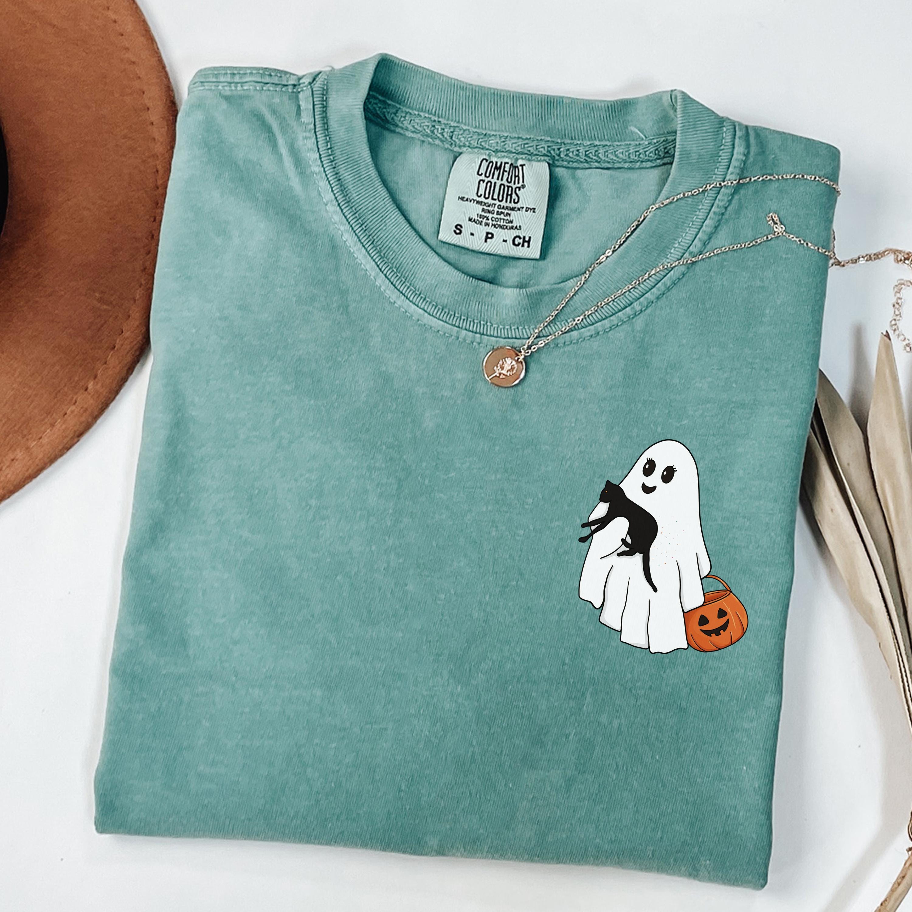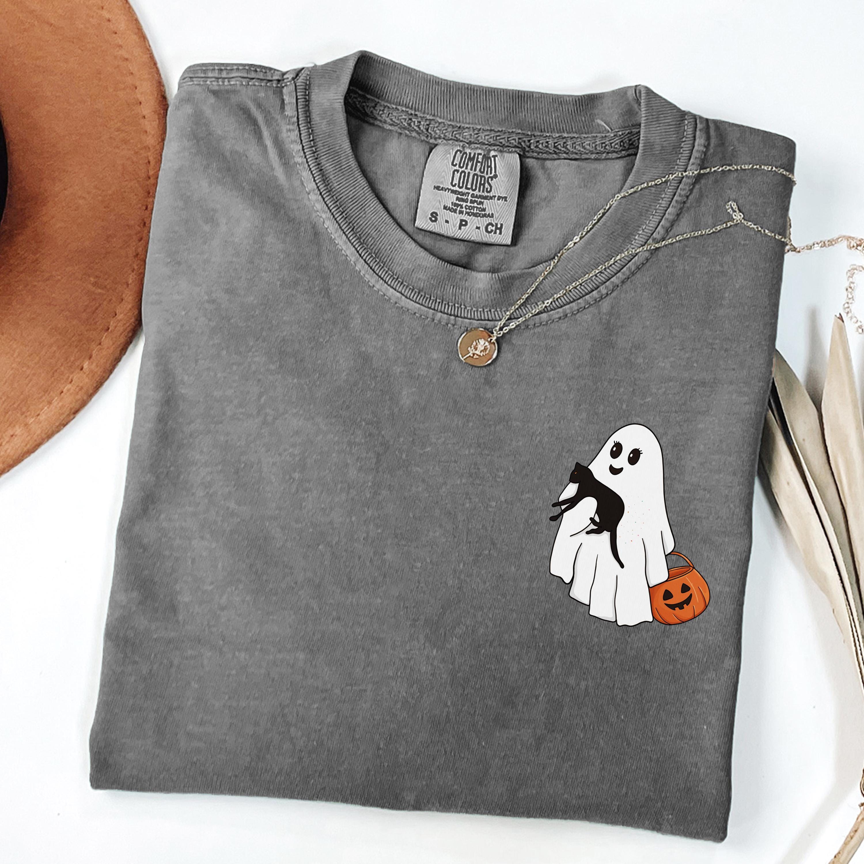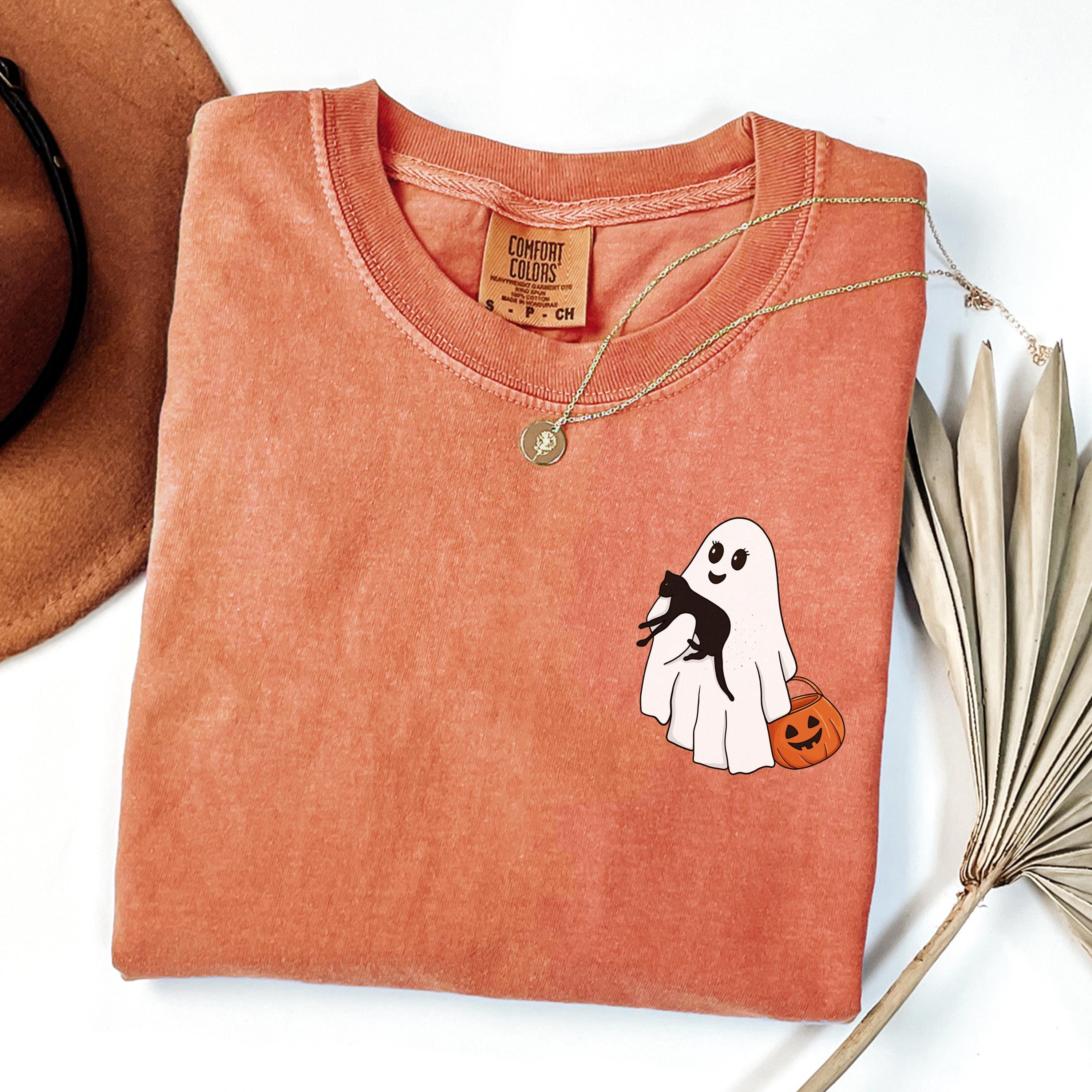 Comfort Colors® Halloween Black Cat & Ghost Shirt, Halloween Ghost Shirt, Spooky Season Cat Tee, Halloween Cute Women Outfit, Halloween Gift