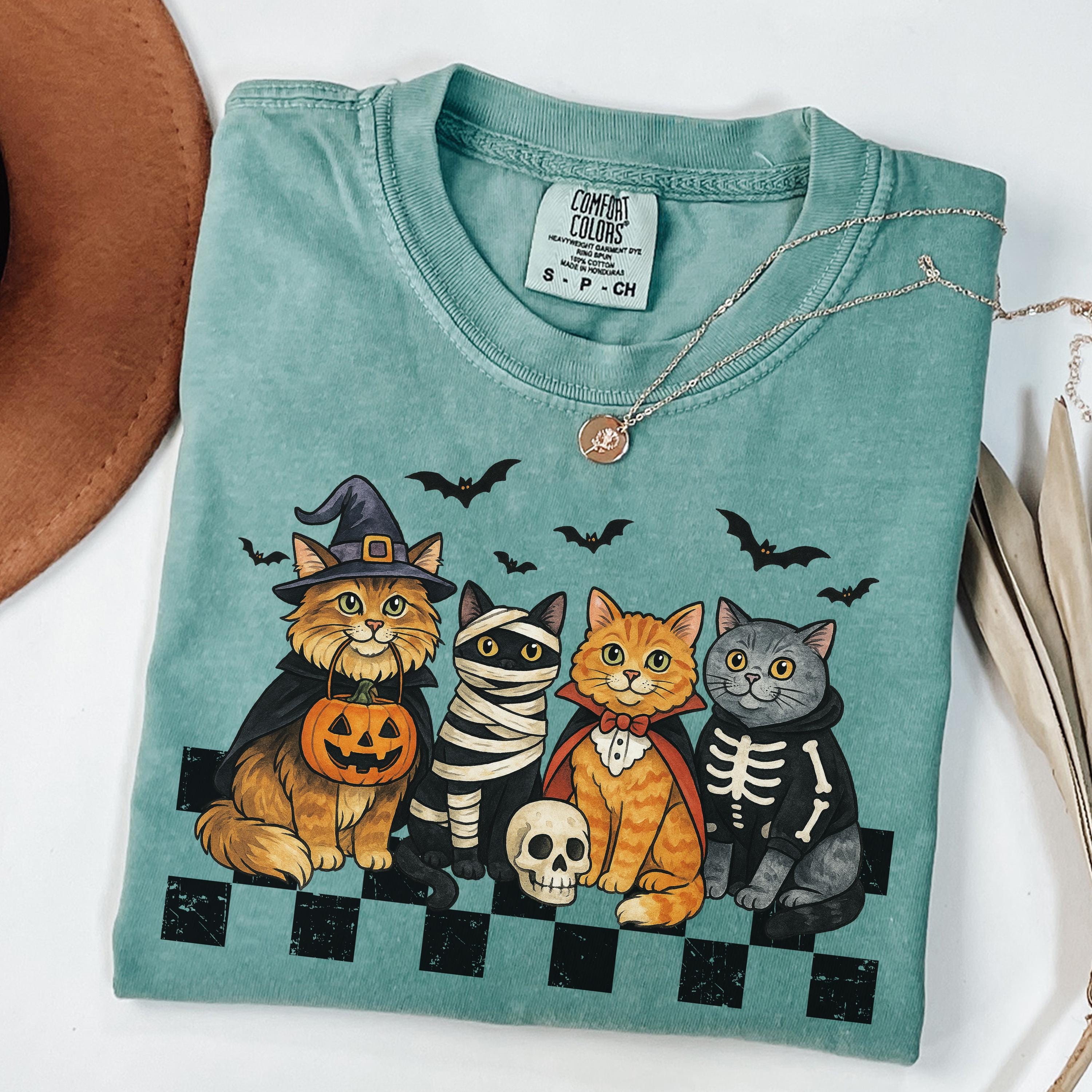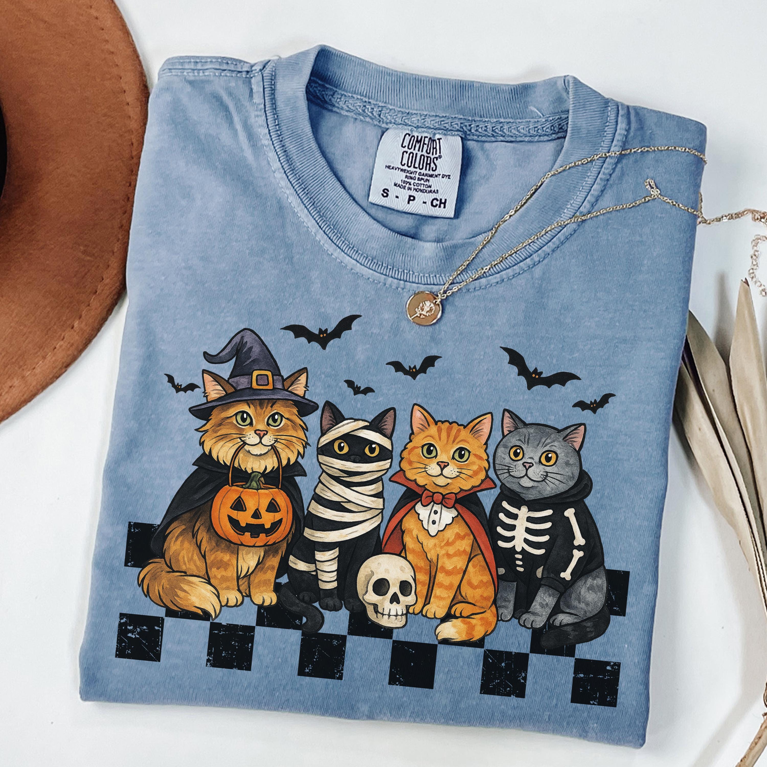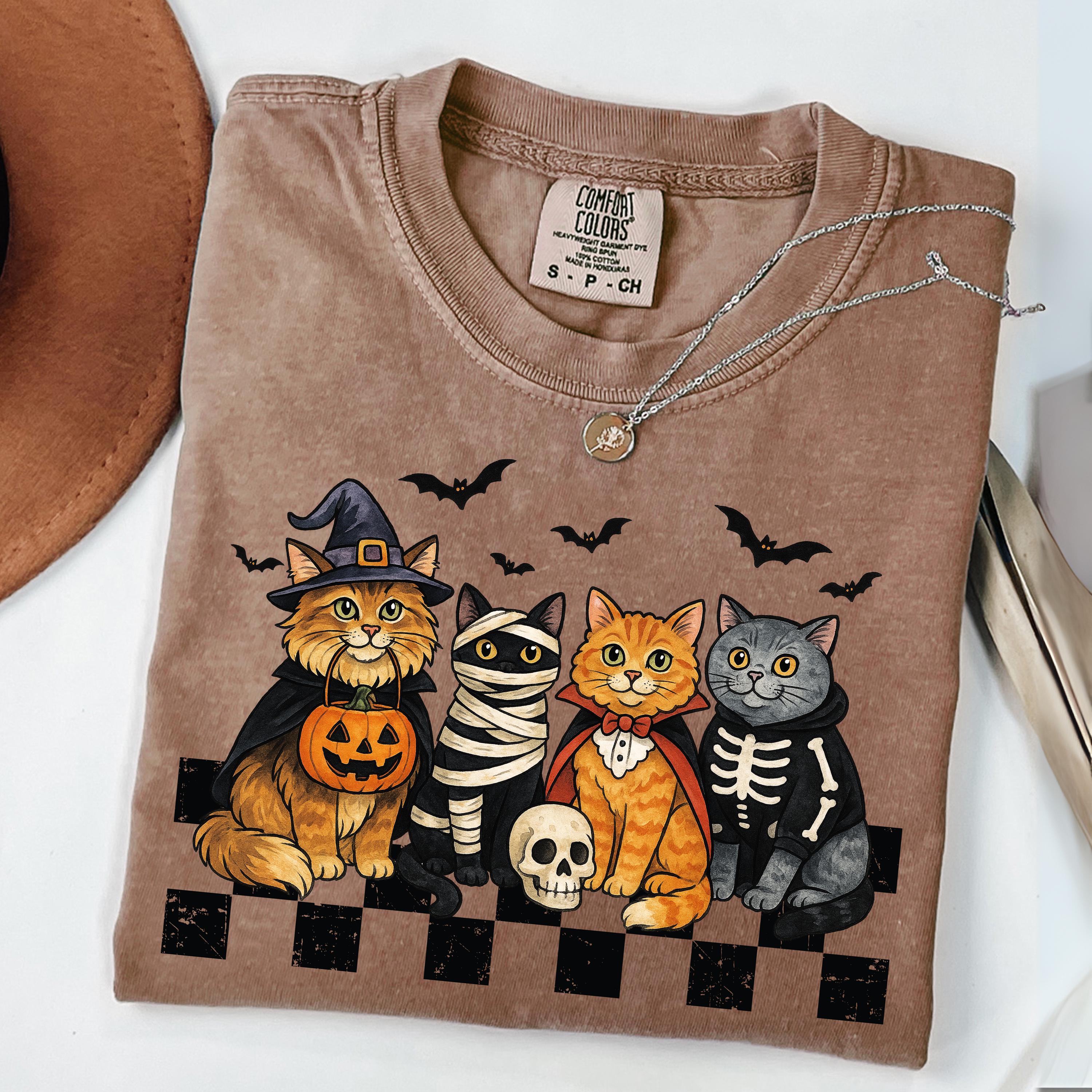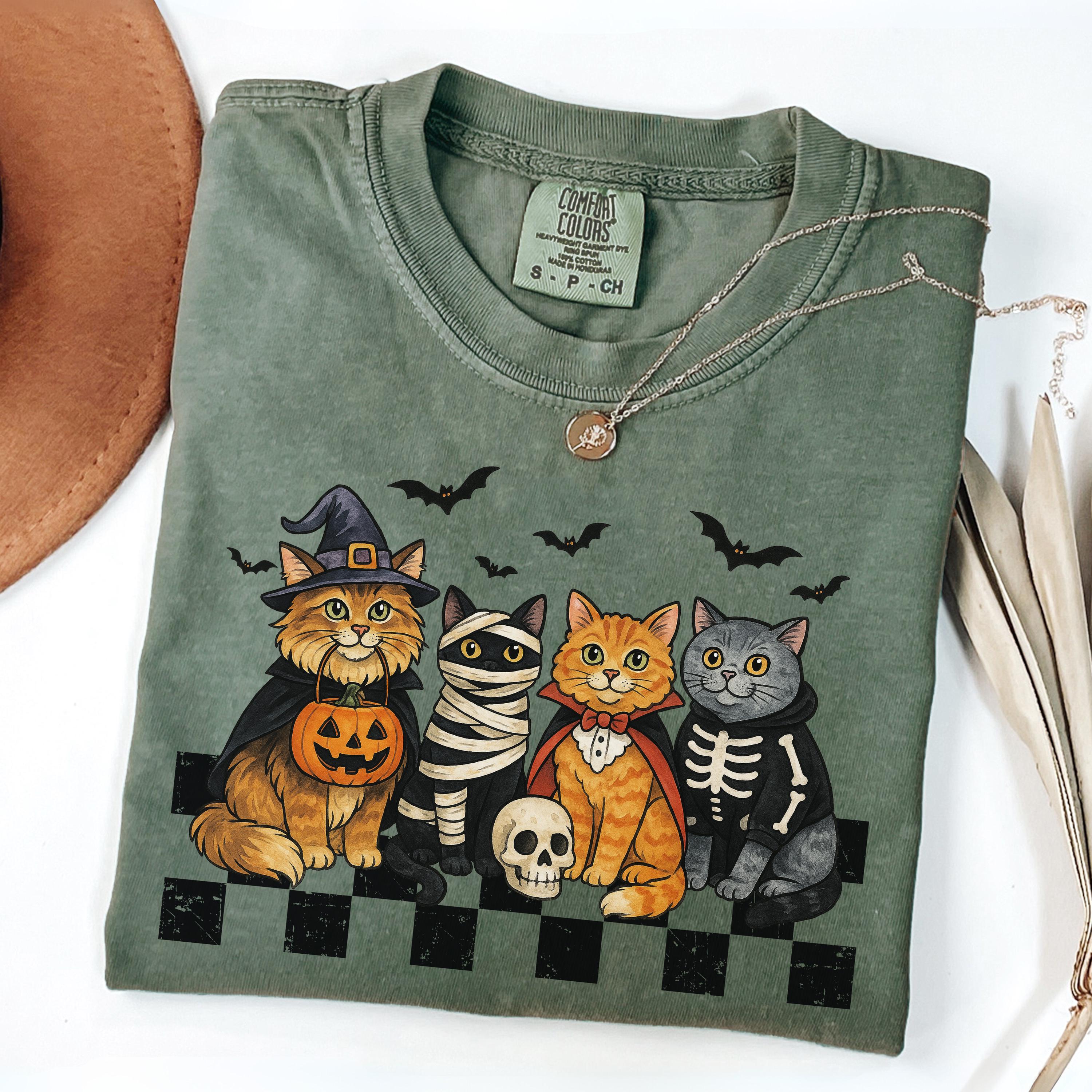 Celebrate Halloween in cozy, spooky style with this Comfort Colors® tee featuring adorable cats in costumes. A purr-fect gift for cat lovers and fall fans!