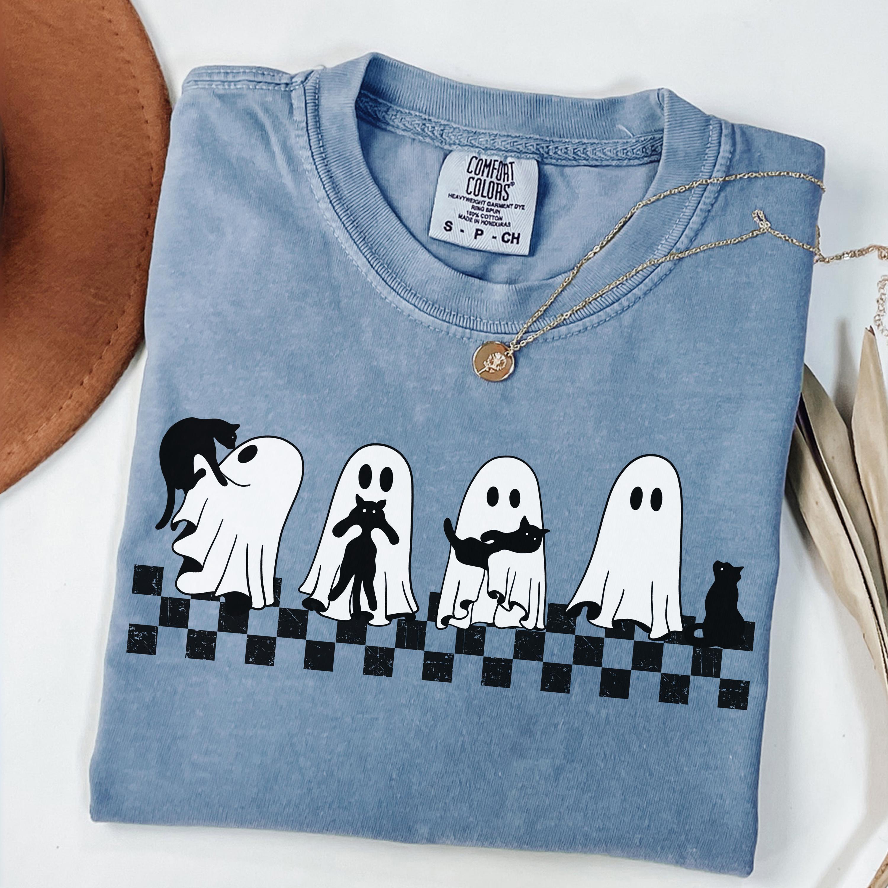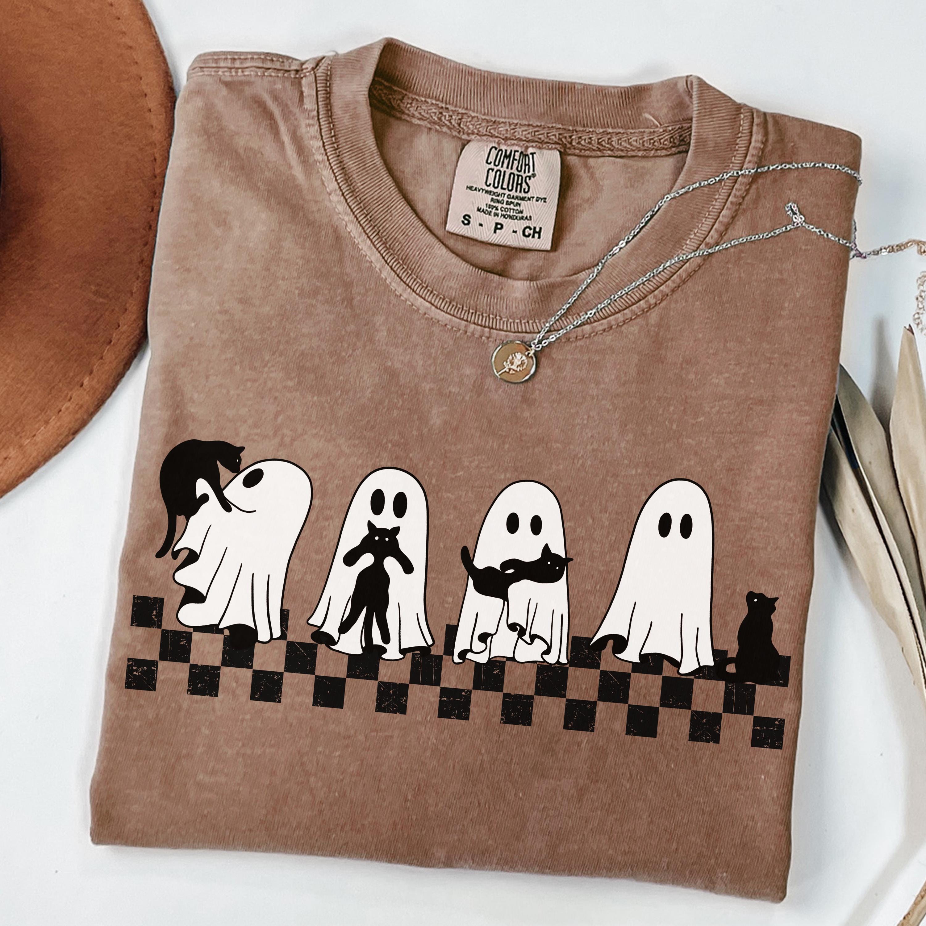 Soft and comfy tee featuring adorable ghosts and black cats — the perfect Halloween vibe for spooky season lovers! A fun and unique gift for cat moms and women who love Comfort Colors® style.