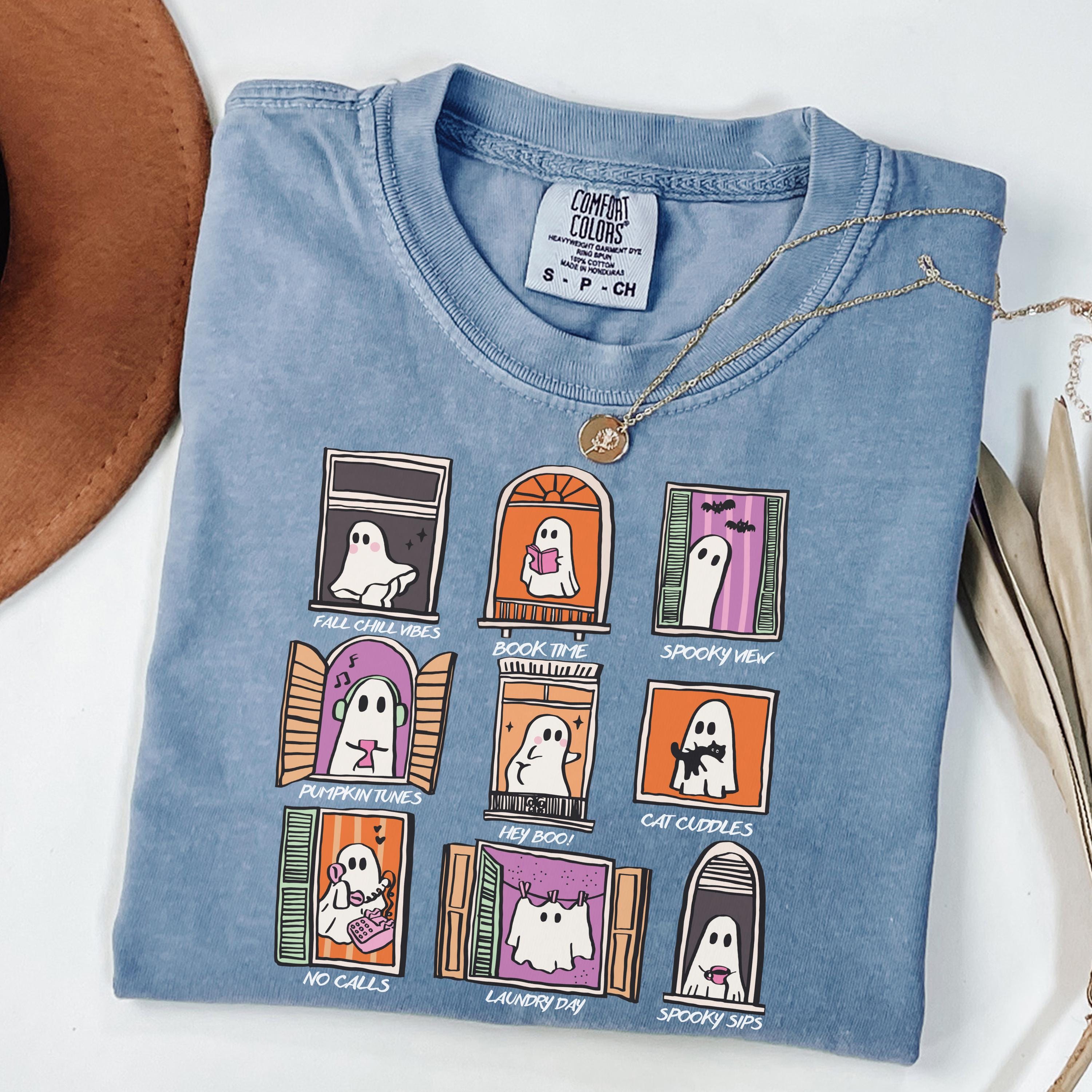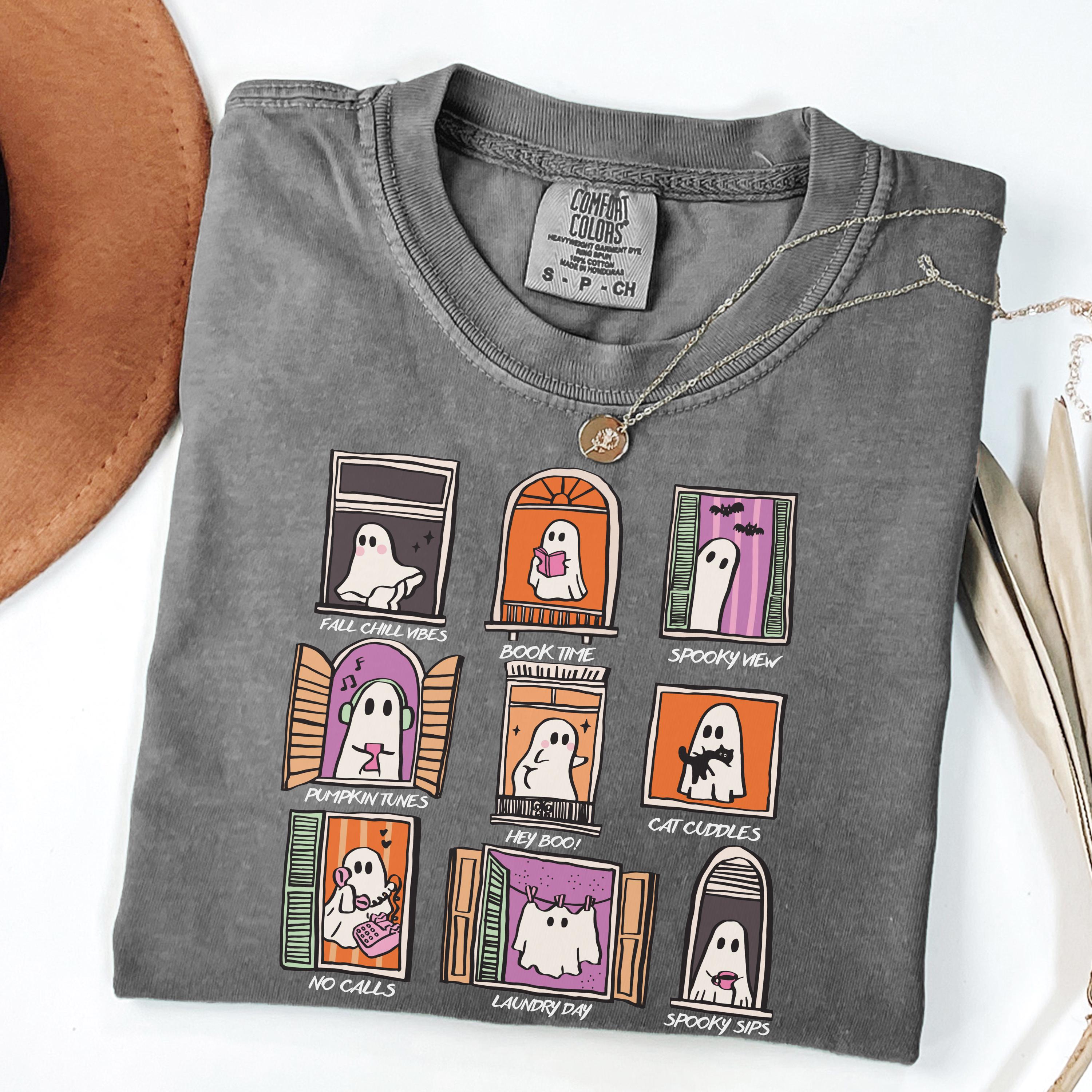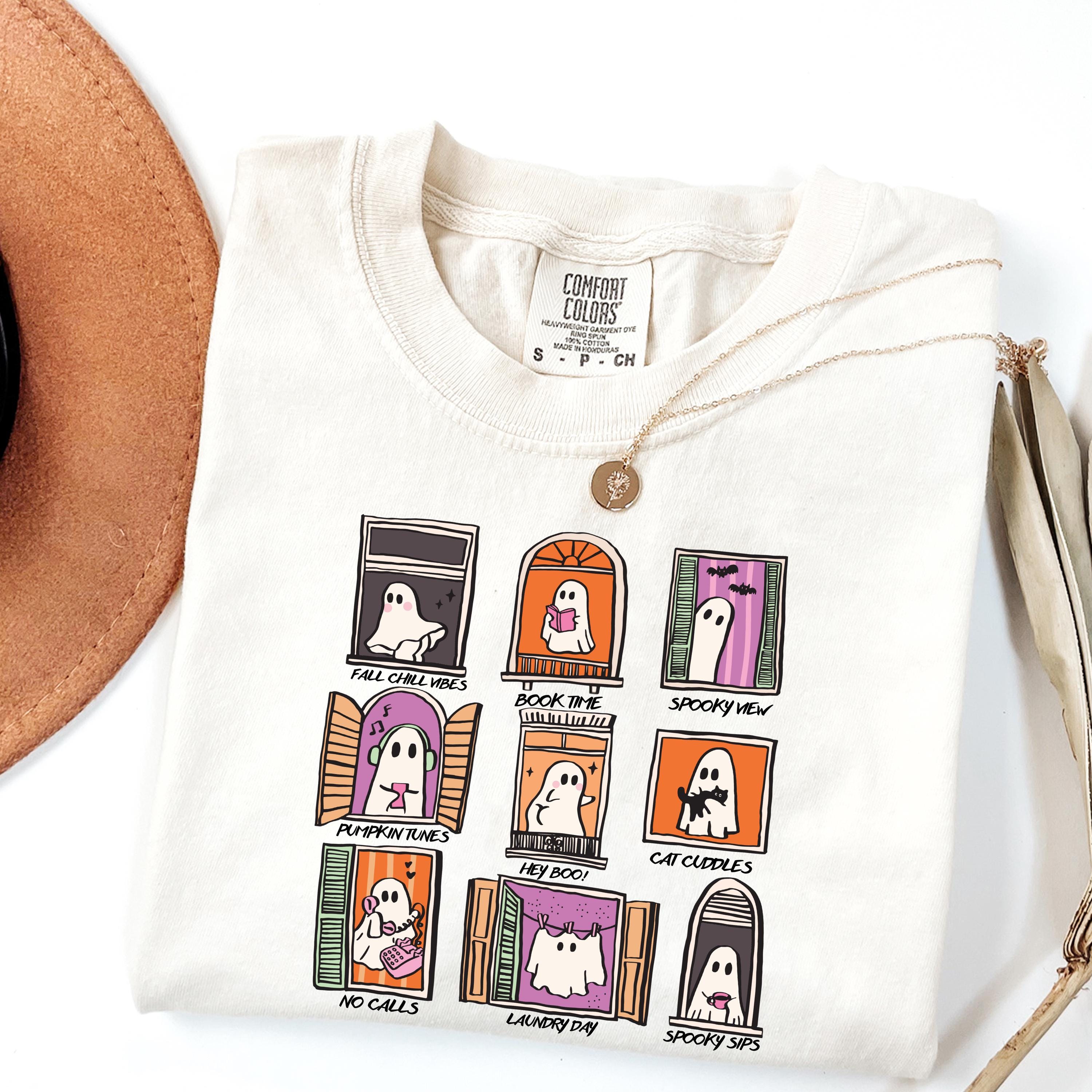 This retro-style Comfort Colors® tee features adorable ghost stamps enjoying cozy fall moments—like sipping, cuddling cats, reading books, and more! Perfect for anyone who loves vintage Halloween vibes, soft cotton comfort, and cute spooky ghosts.
