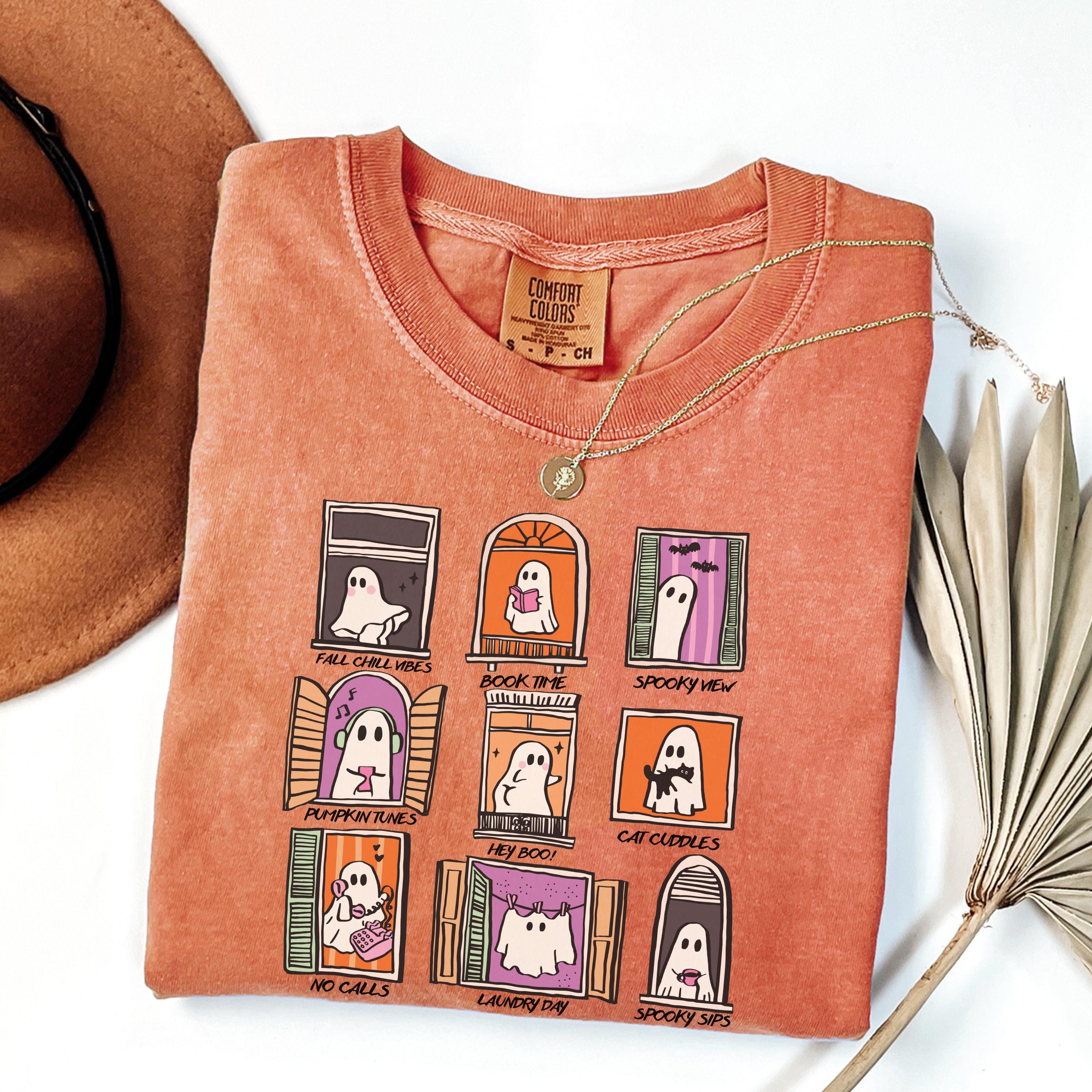 Comfort Colors® Cute Ghost Shirt, Halloween Cat Tee, Retro Pumpkin Shirt Halloween, Fall Ghost Shirt, Spooky Season Shirt,Cozy Halloween Tee