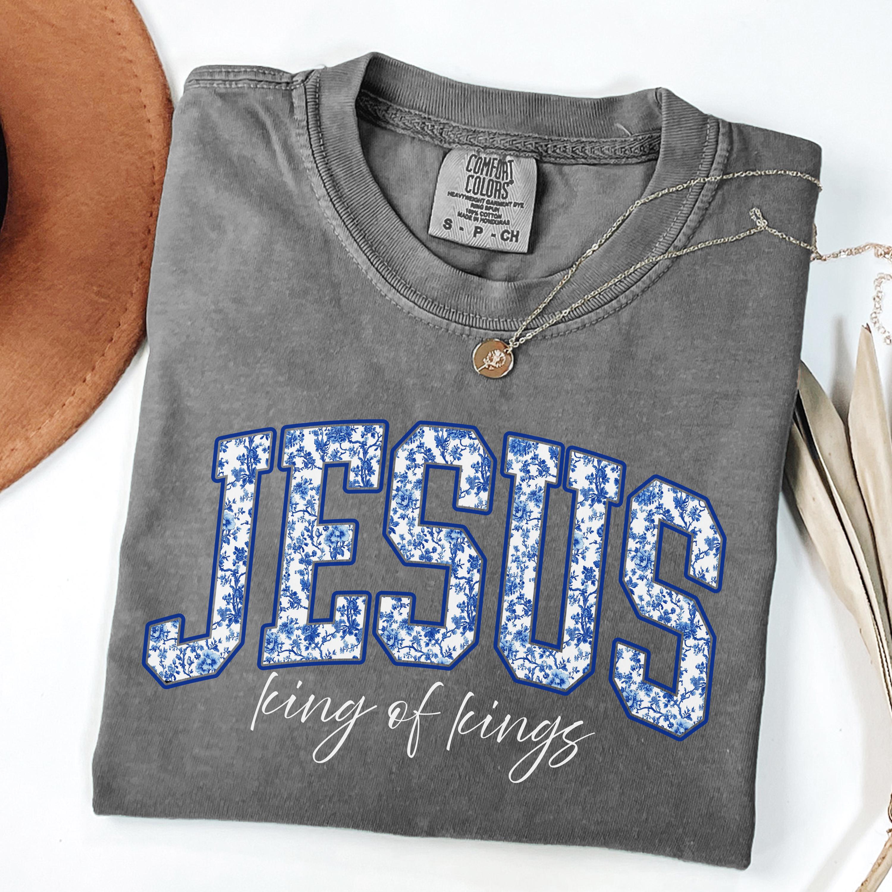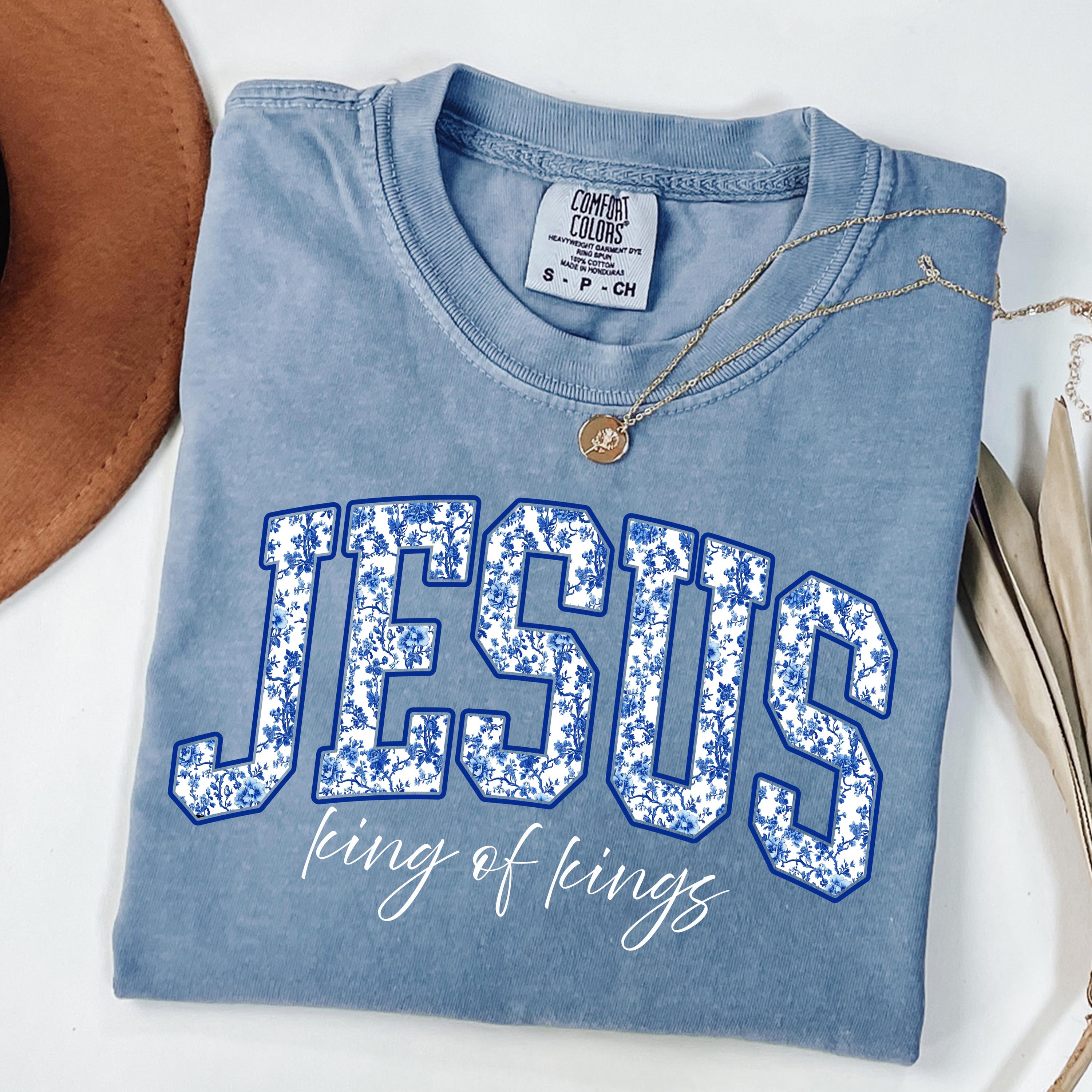 This Comfort Colors® Jesus Shirt is a bold declaration of faith. Featuring varsity floral “JESUS” lettering with the phrase King of Kings, this Christian tee is the perfect inspirational shirt for church, Bible study, or as a meaningful religious gift. 🙏✝️