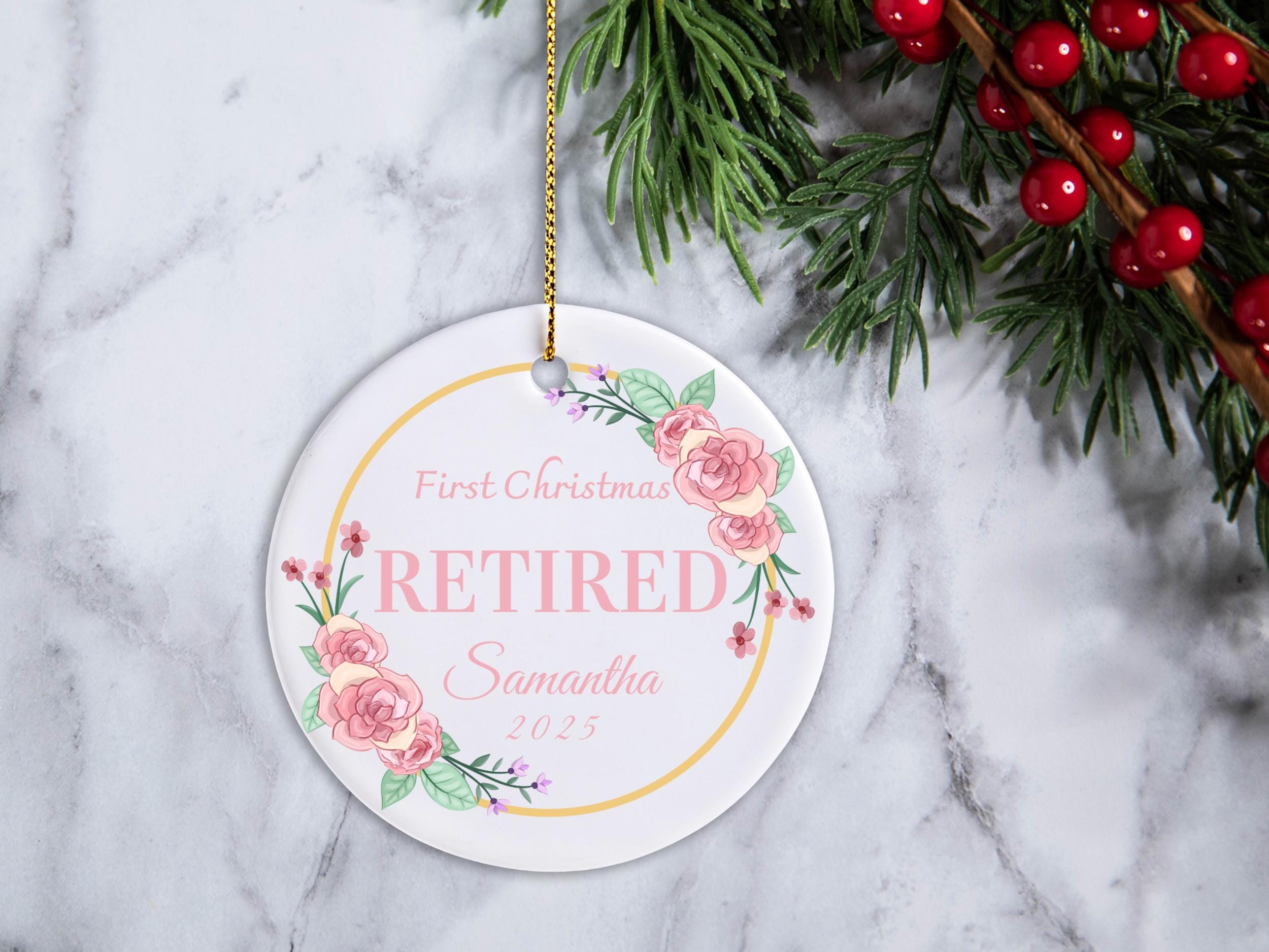 Celebrate a new milestone with this First Christmas Retired Ornament. Personalized with name and year, it makes a unique keepsake to honor retirement and a thoughtful Christmas gift for friends, family, or coworkers.