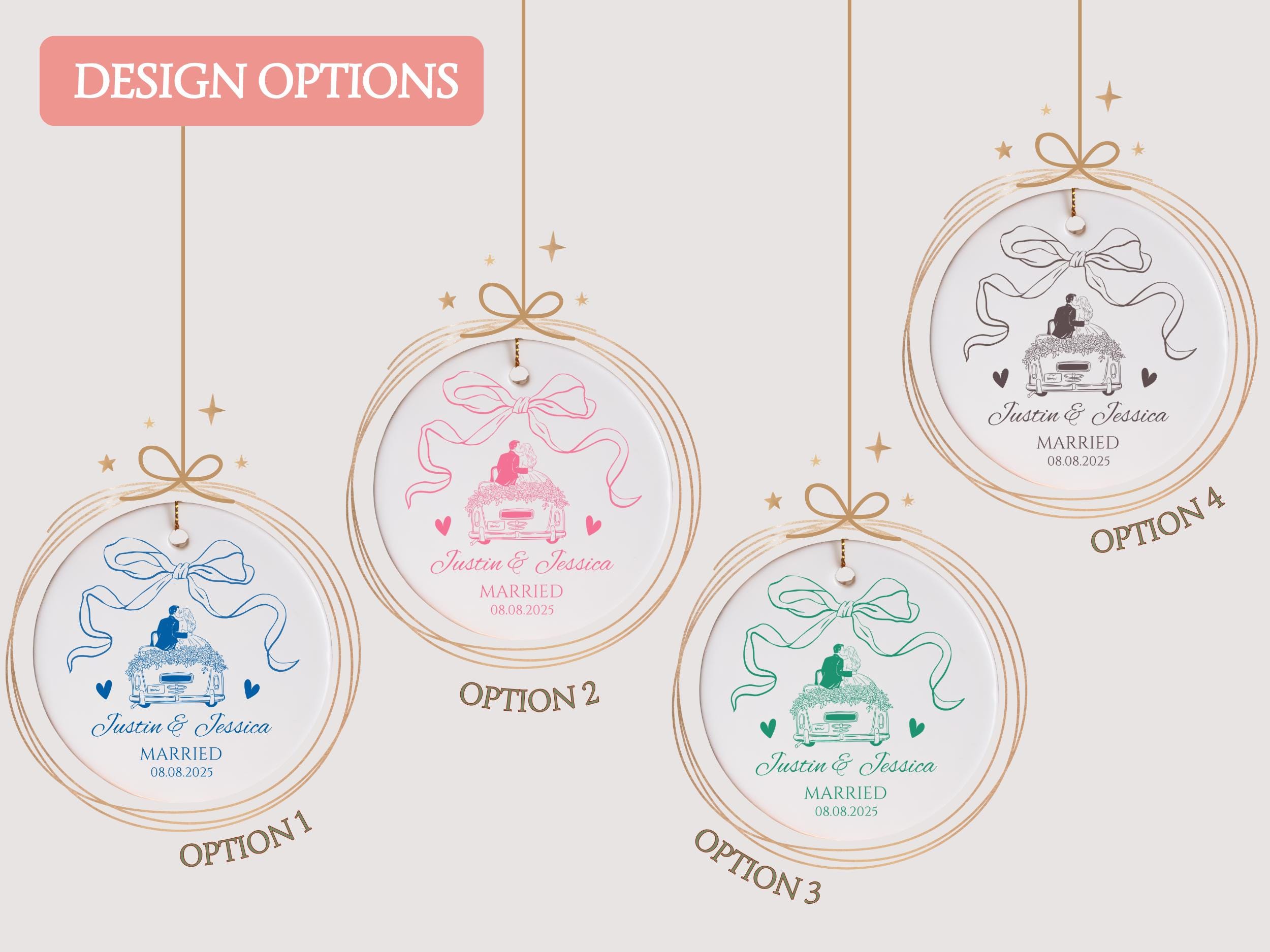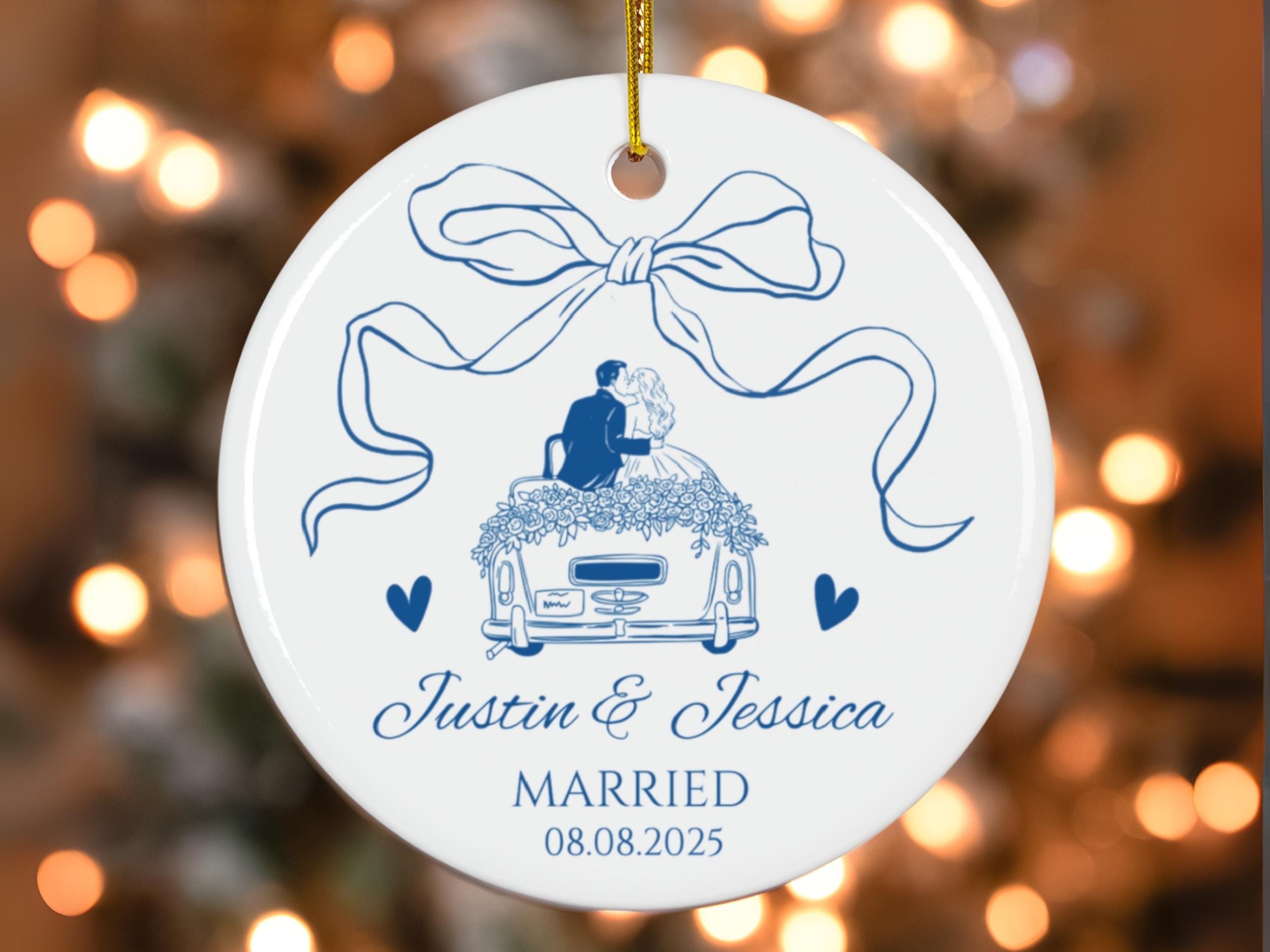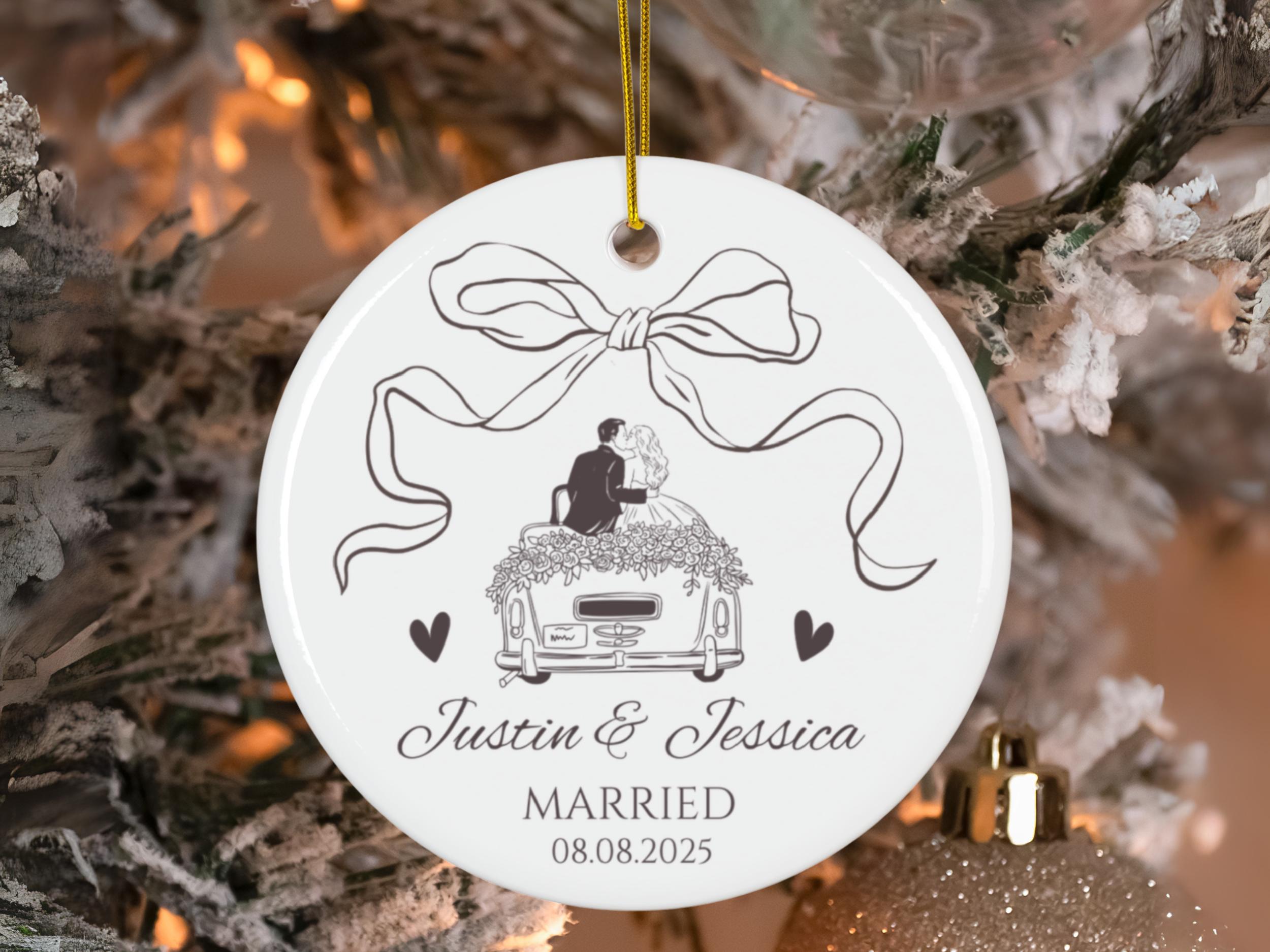 Celebrate your love with our First Christmas Married Ornament 2025 🎀. Featuring a romantic bride & groom design on a classic car with a decorative bow, this personalized ornament is the perfect keepsake for newlyweds.