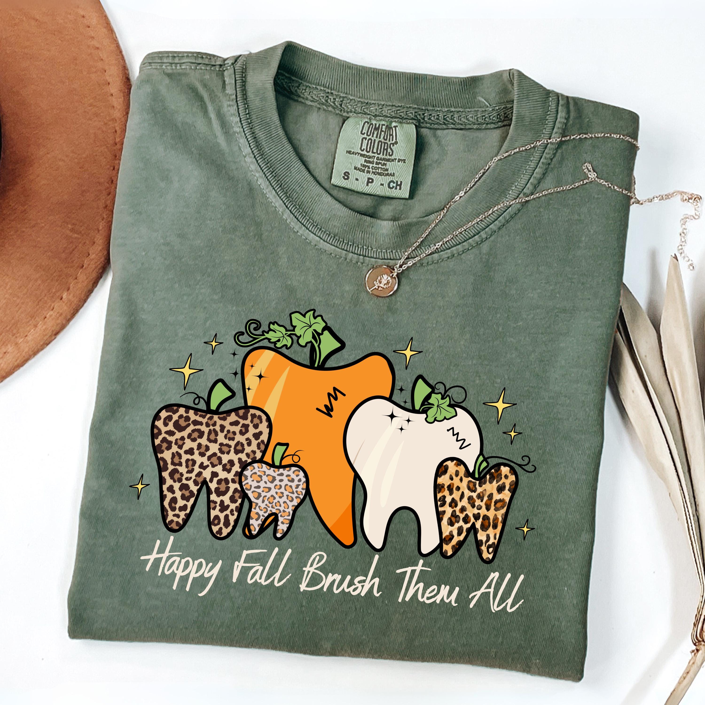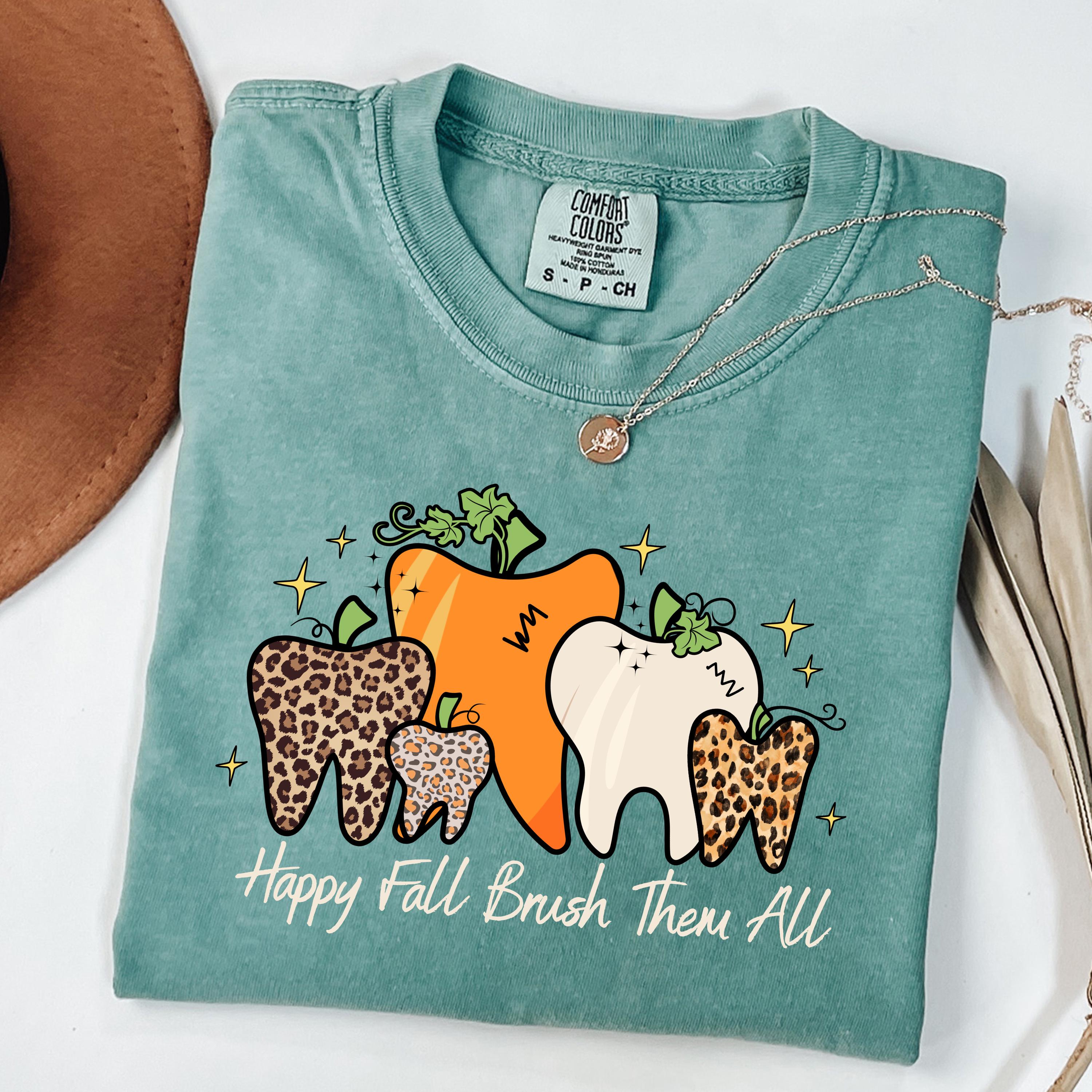 Comfort Colors® Happy Fall Brush Them All Shirt, Funny Dental T-Shirt, Cute Hygienist Shirt, Dentist Fall Tee, Pumpkin Tooth Graphic Tee