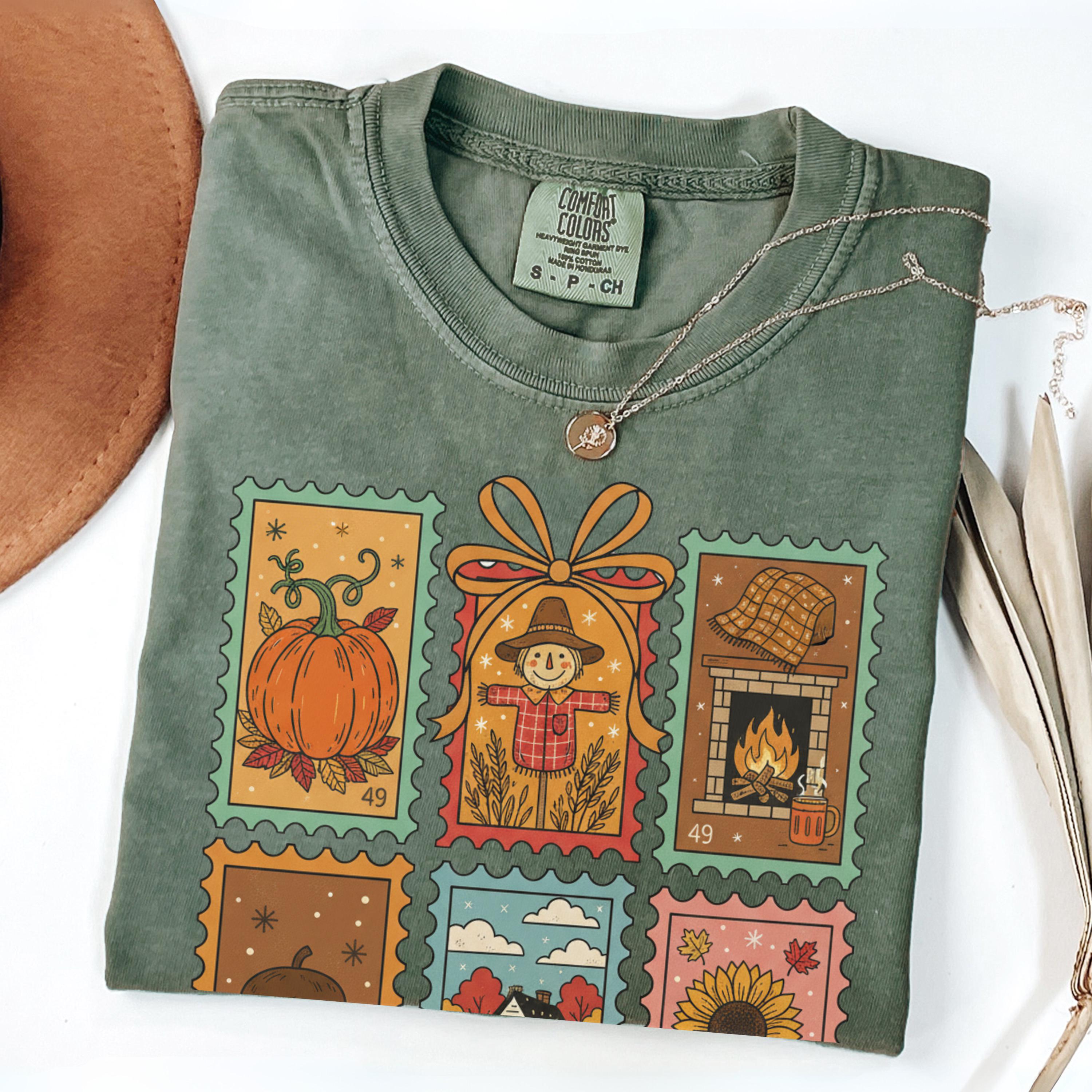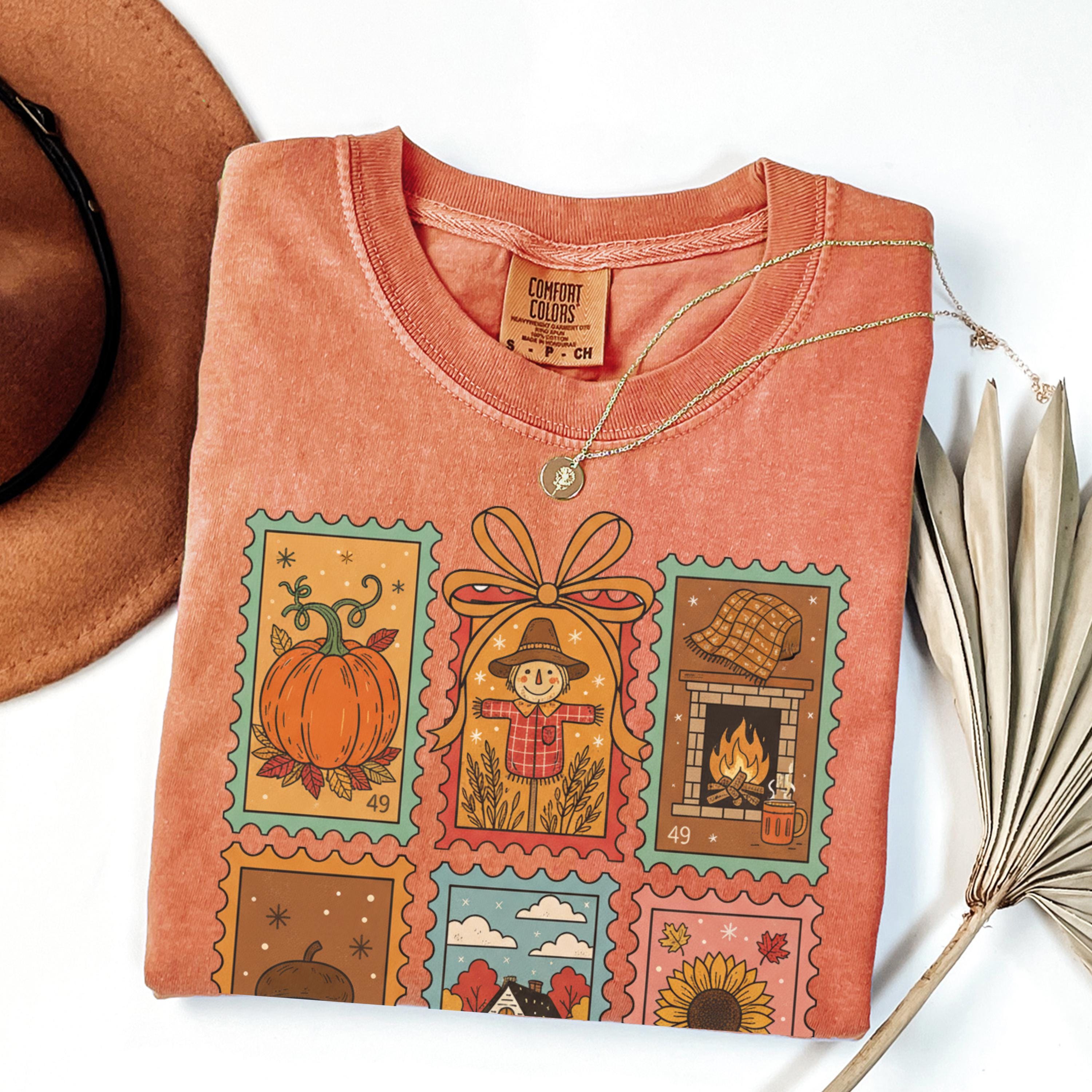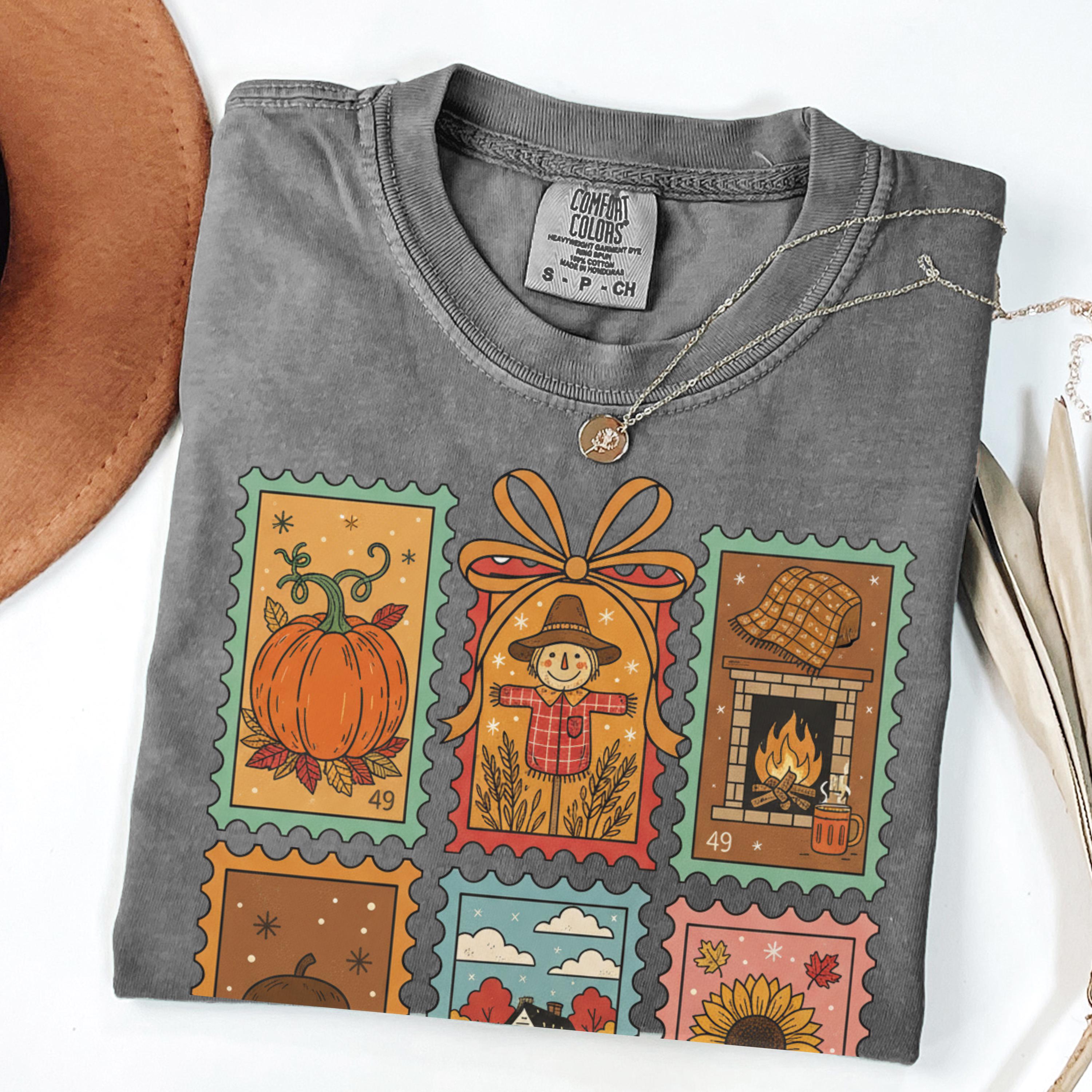Comfort Colors® Fall Stamp Shirt, Retro Autumn Postcard Tee, Pumpkin Scarecrow Sunflower Shirt, Women's Fall Sweatshirt, Cozy Harvest Tee
