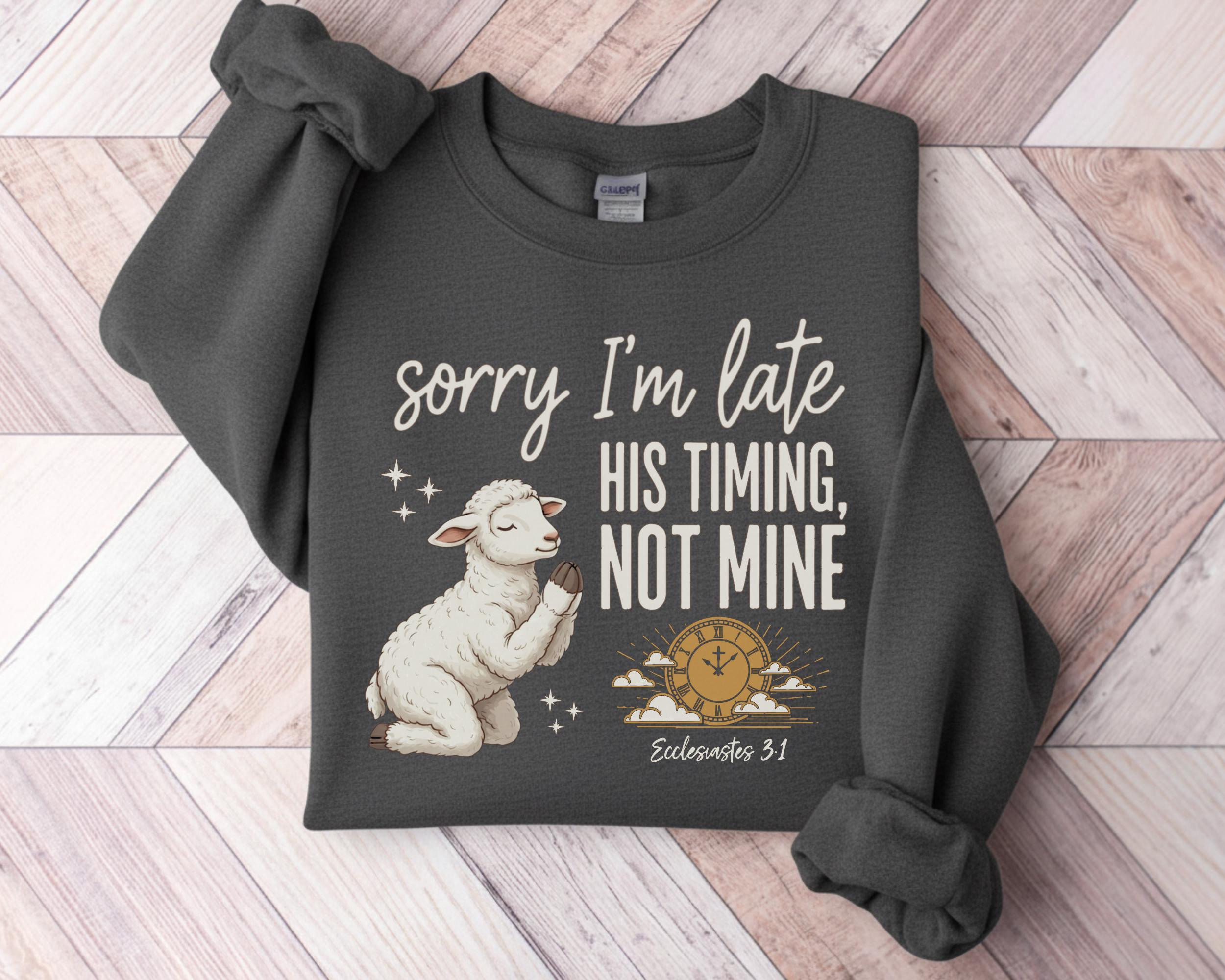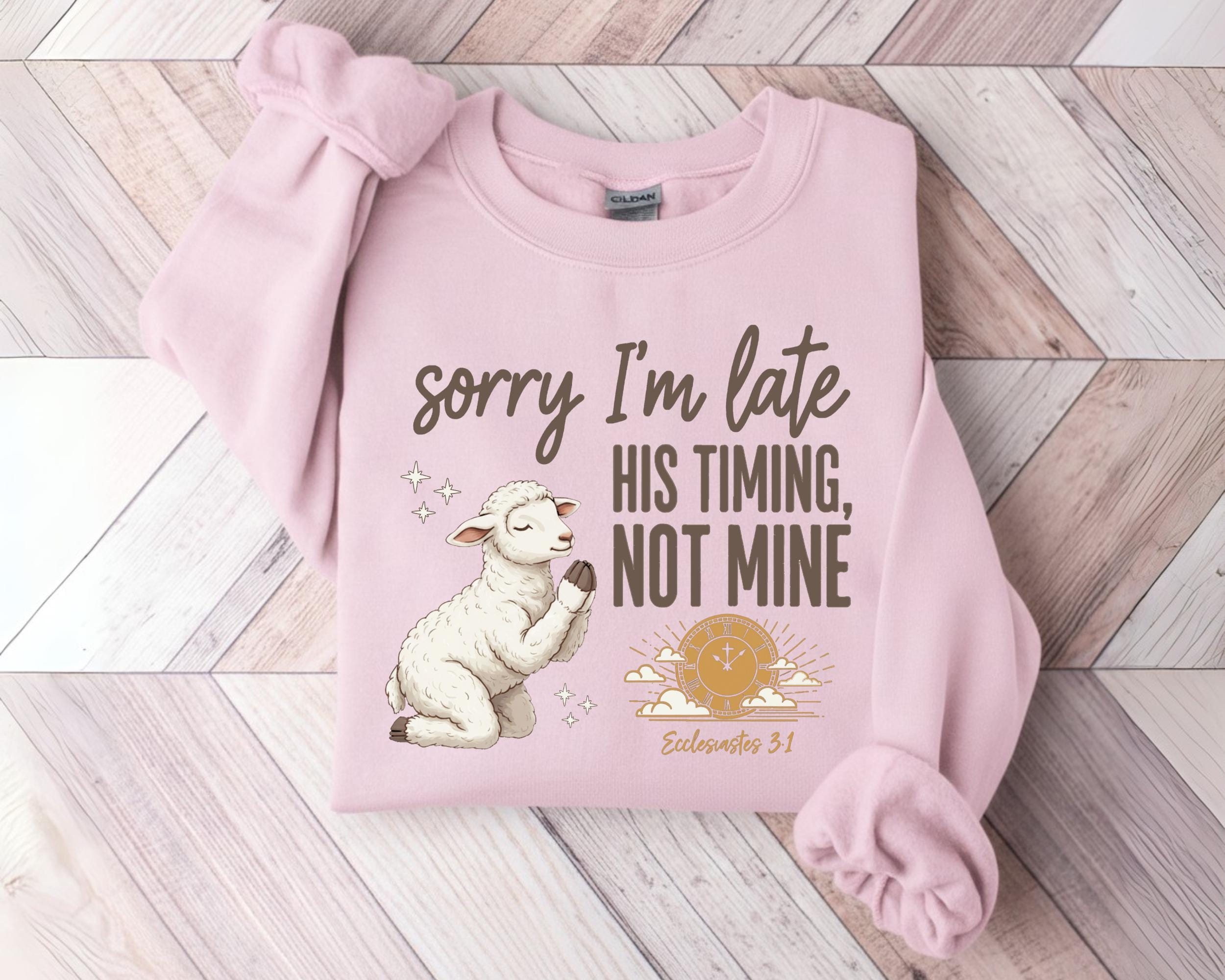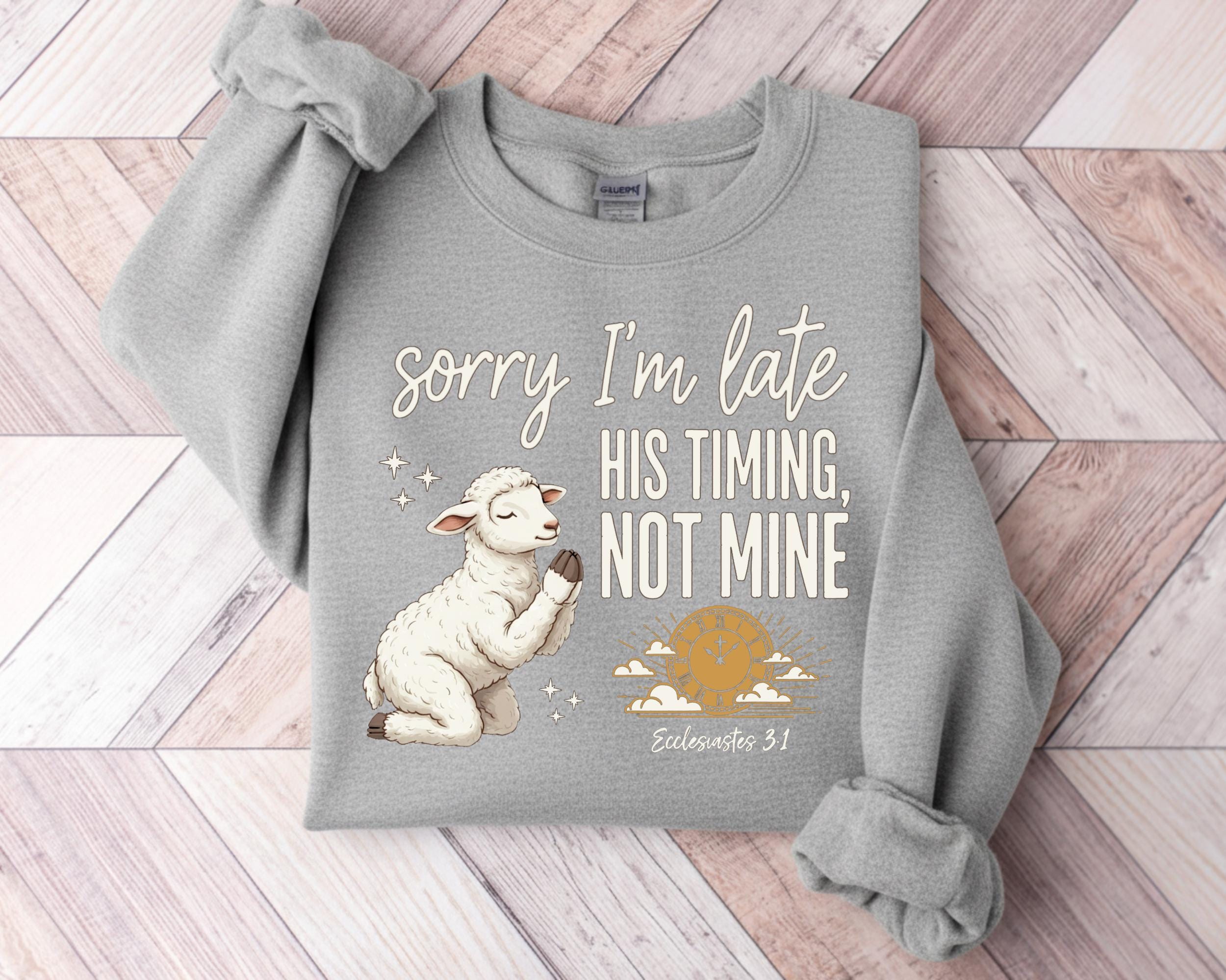 Christian Sweatshirt, Sorry I'm Late His Timing Not Mine, Bible Verse Ecclesiastes 3:1 Tee, Faith Based Religious Gift for Women