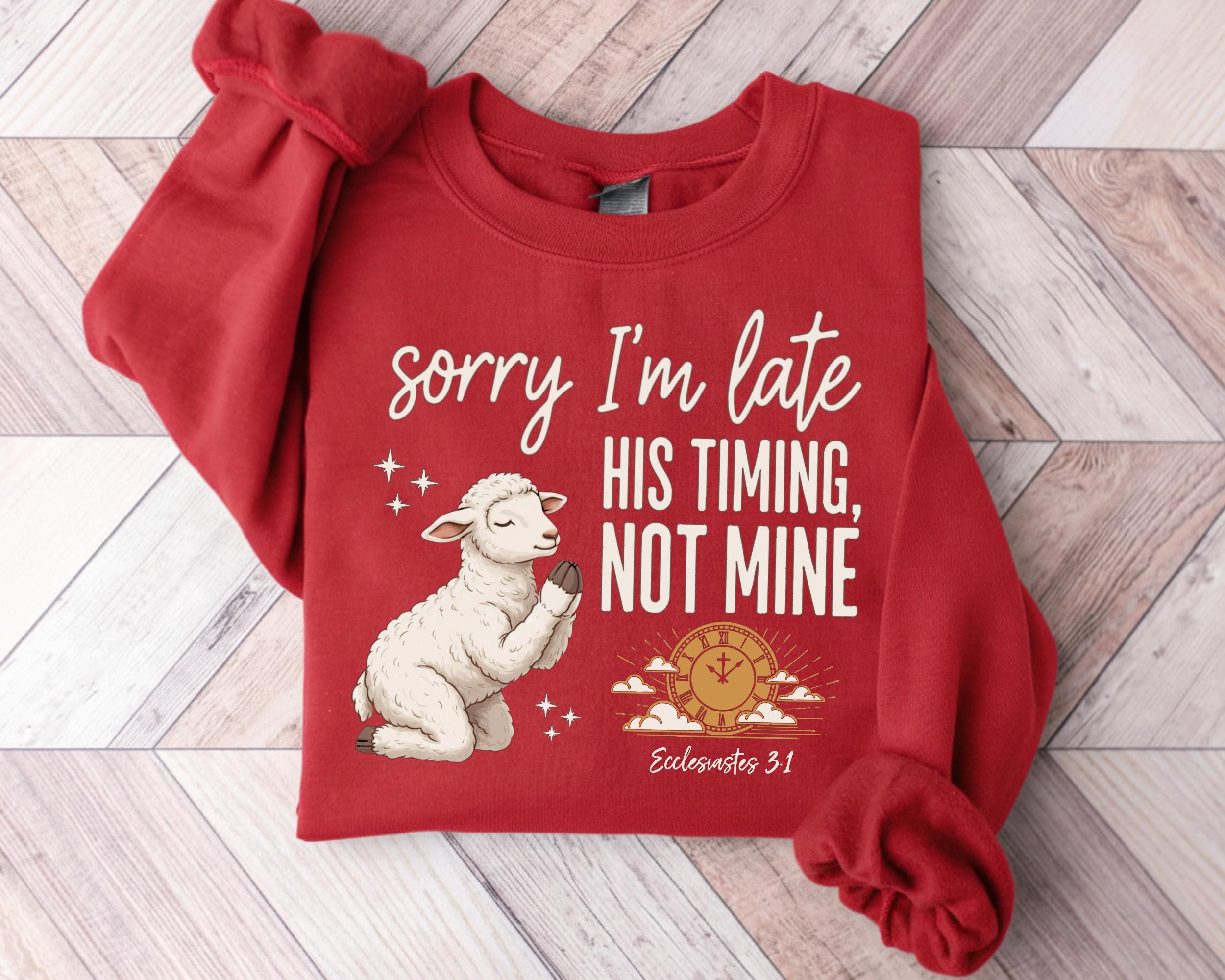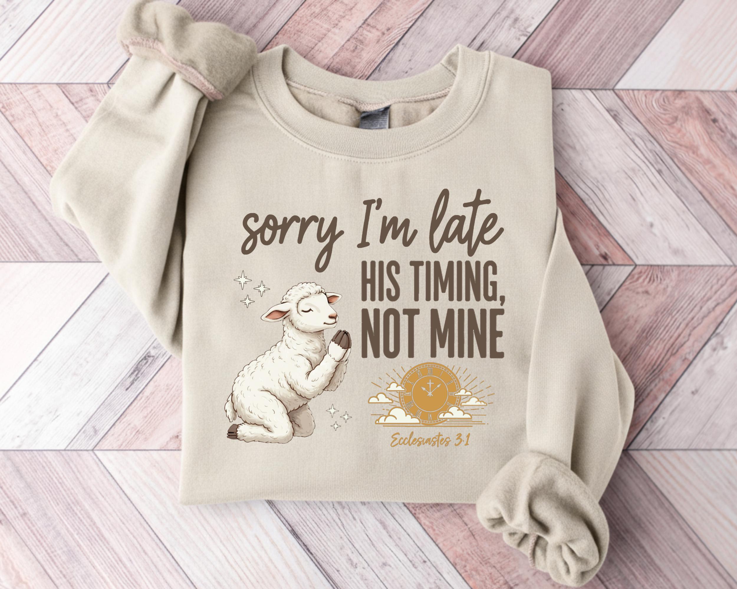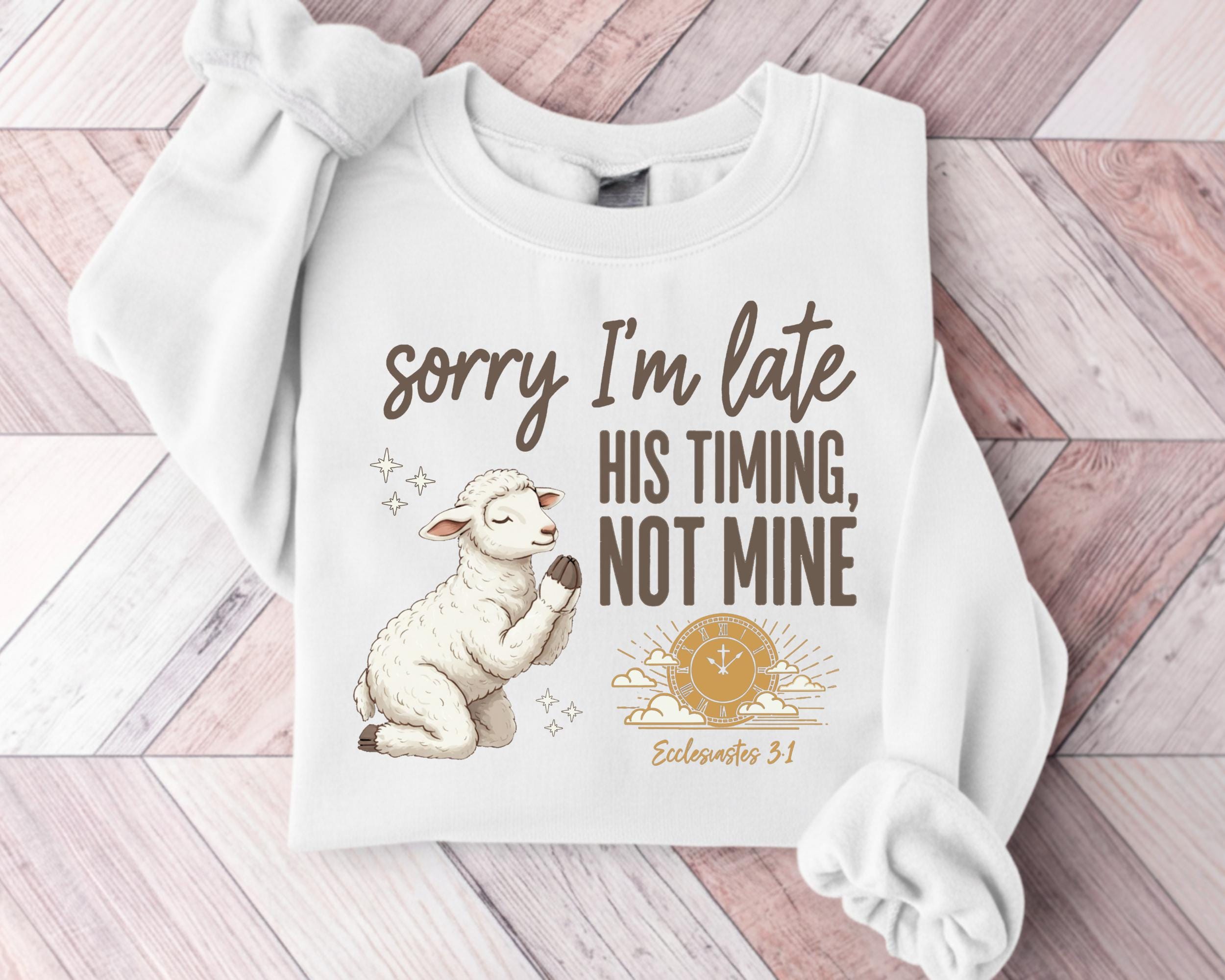 Christian Sweatshirt, Sorry I'm Late His Timing Not Mine, Bible Verse Ecclesiastes 3:1 Tee, Faith Based Religious Gift for Women