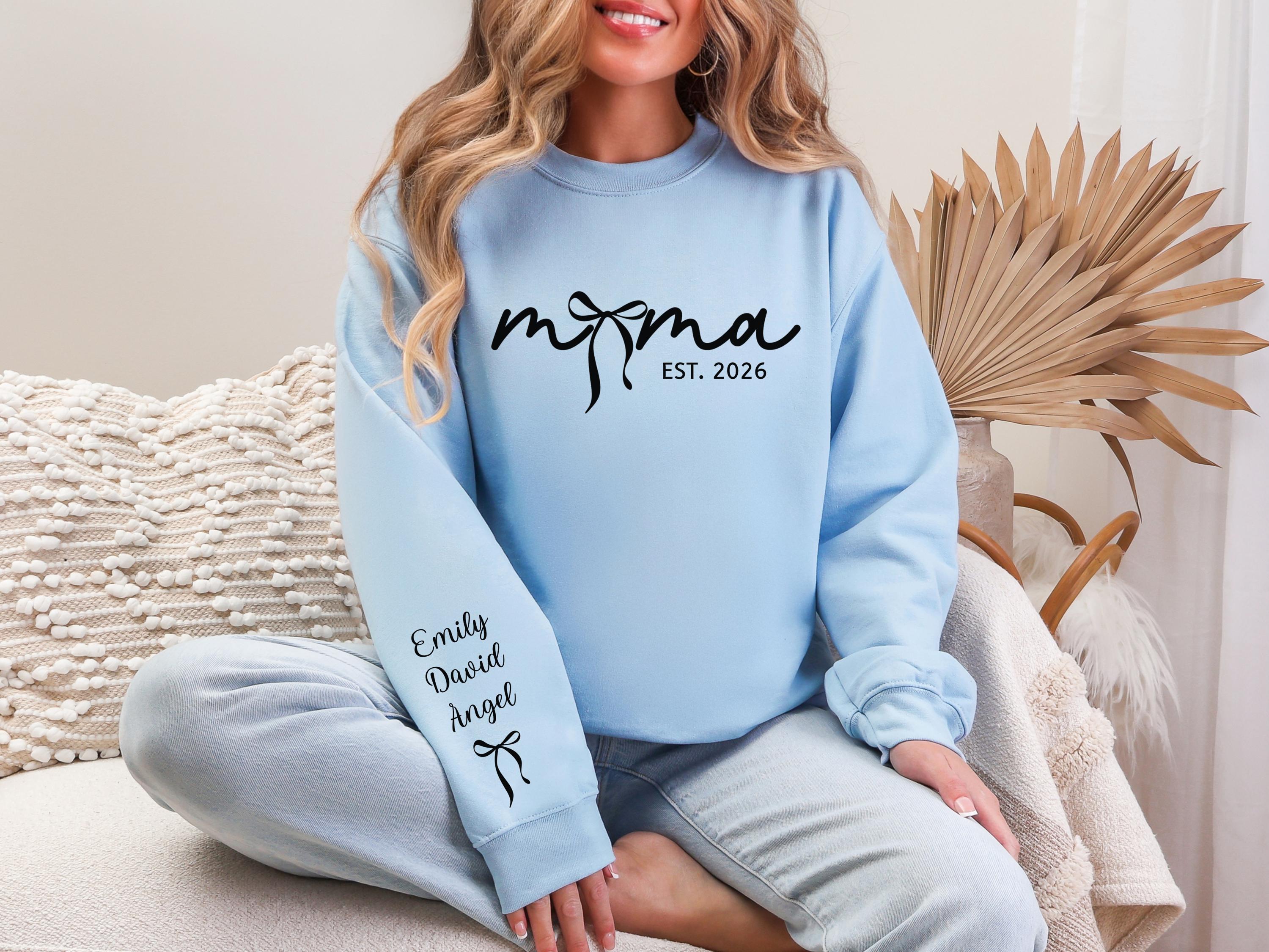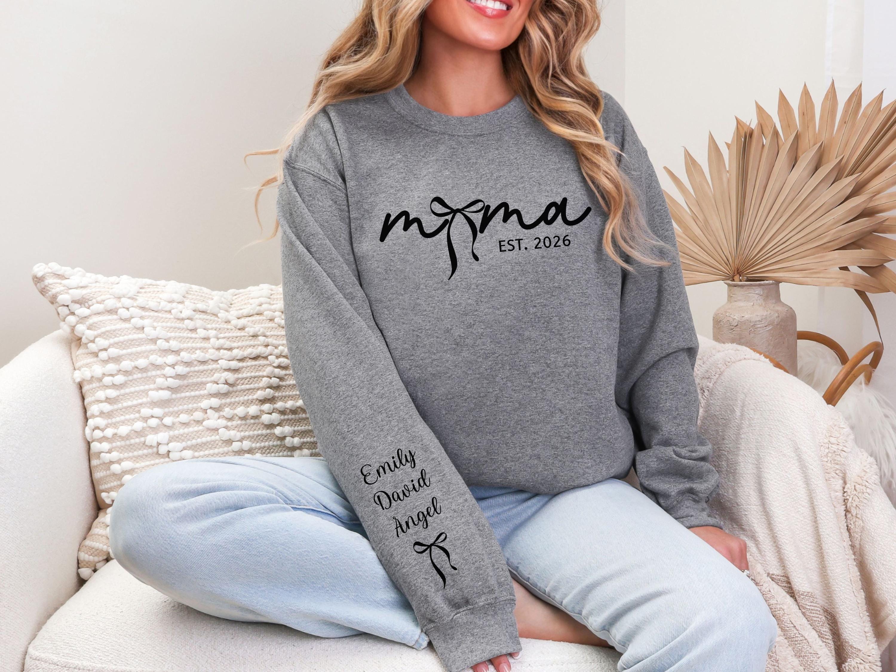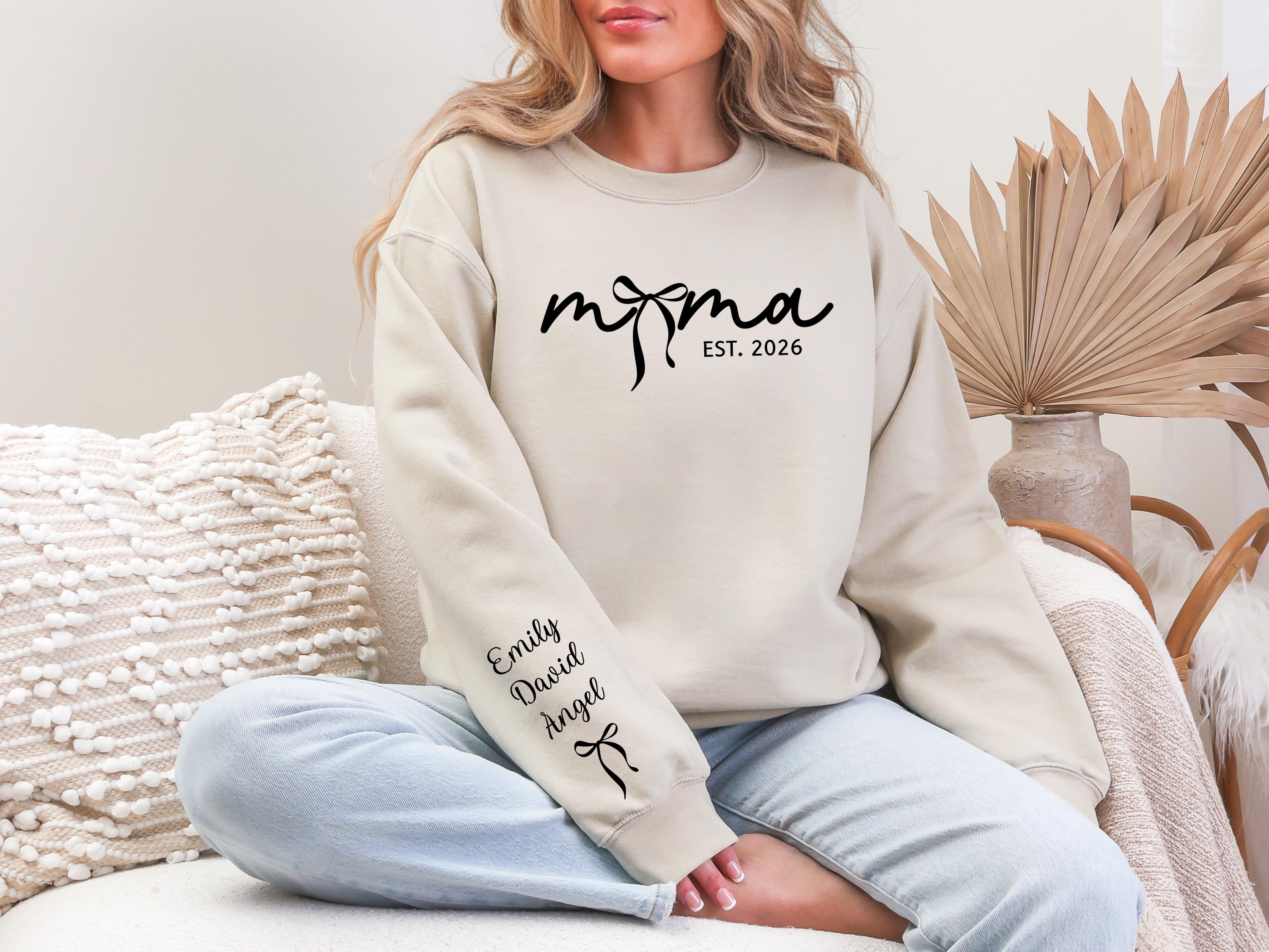 Personalized Bow Mom Sweatshirt, Custom Mama Sweatshirt with Child's Name on Sleeve, Mother's Day Gift for Mom
