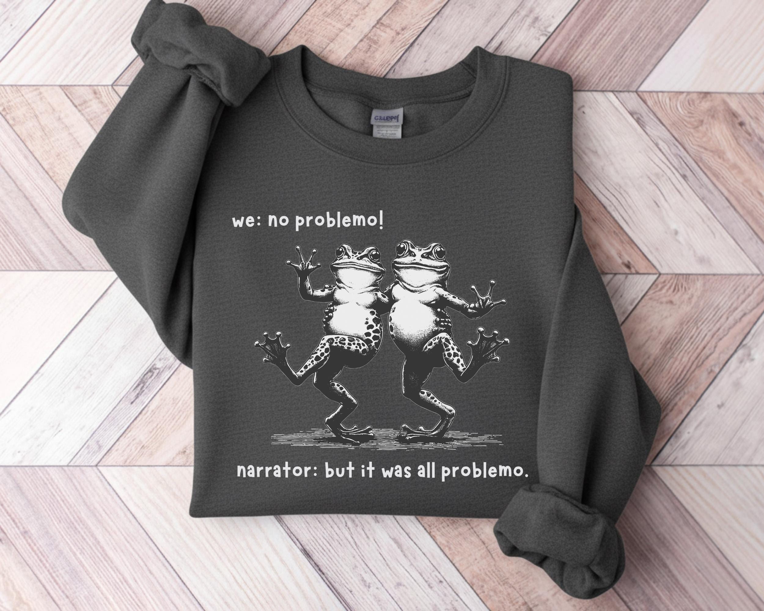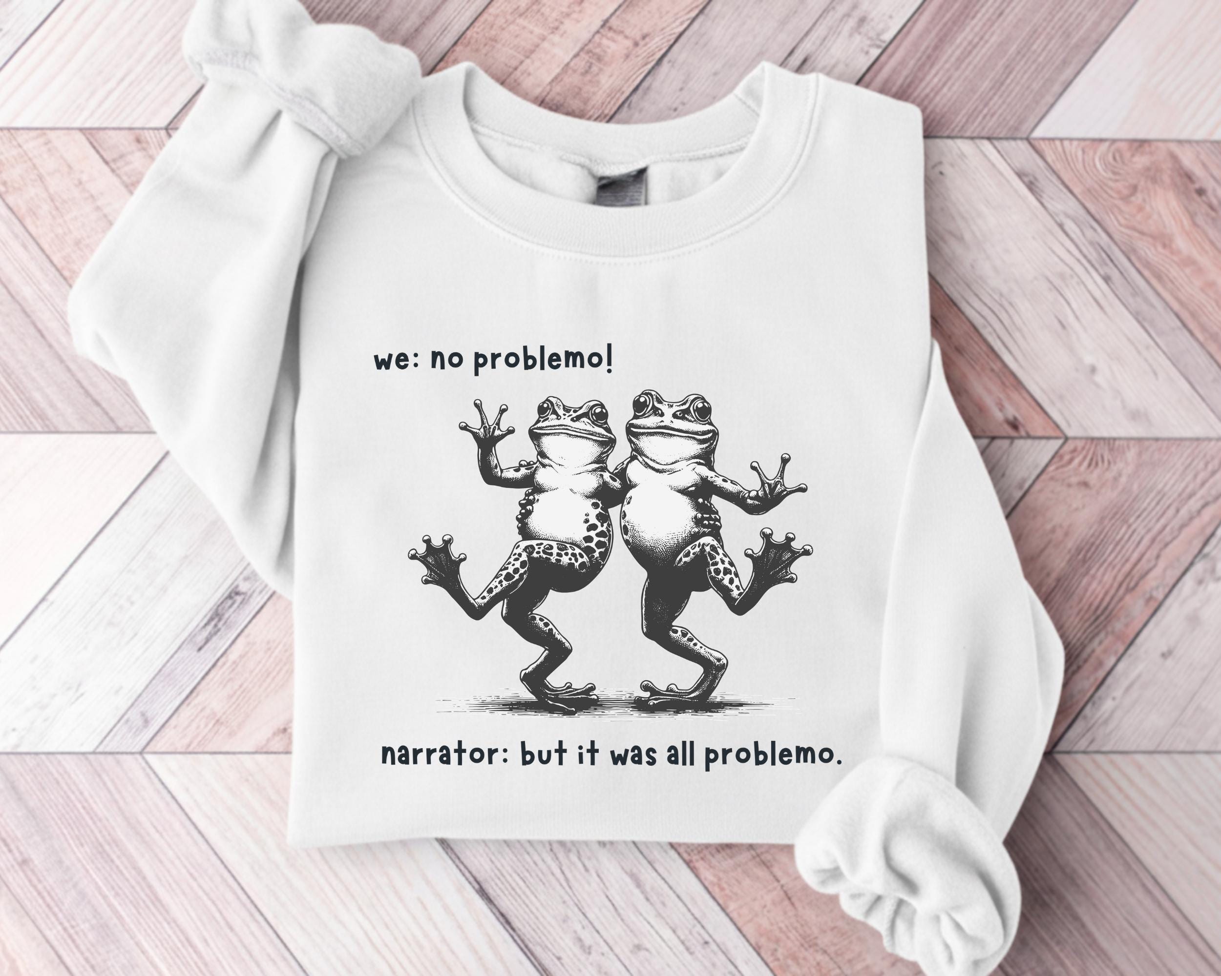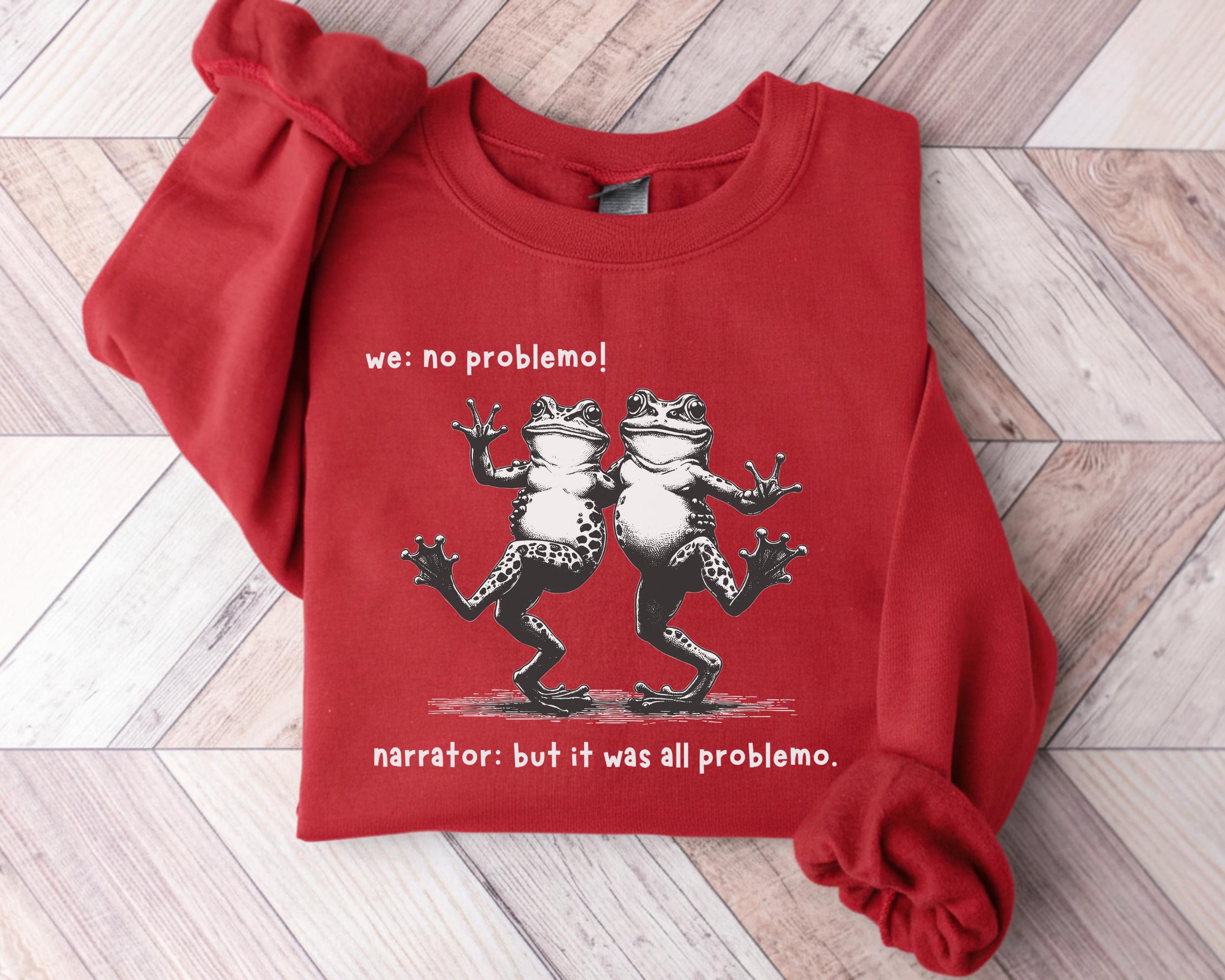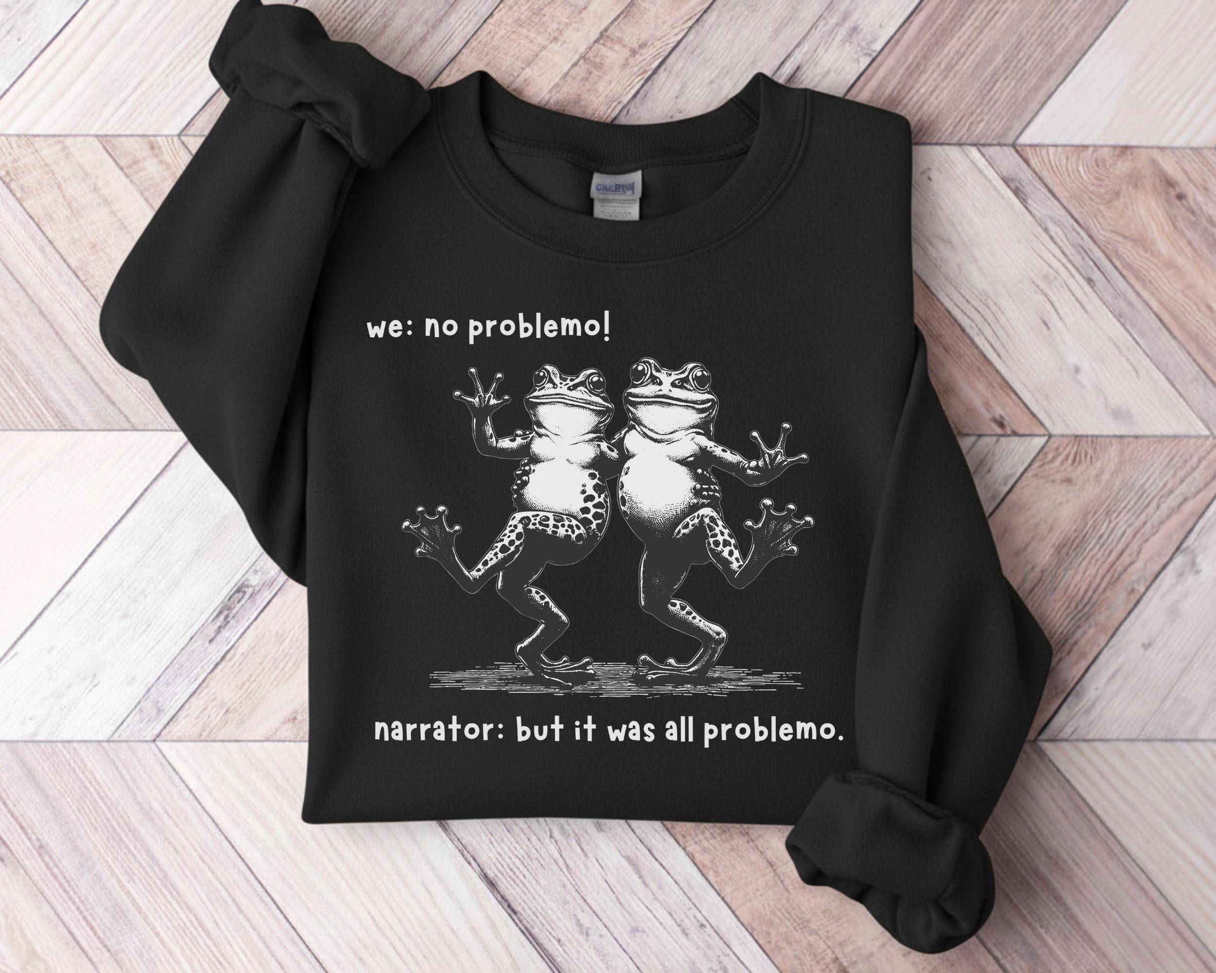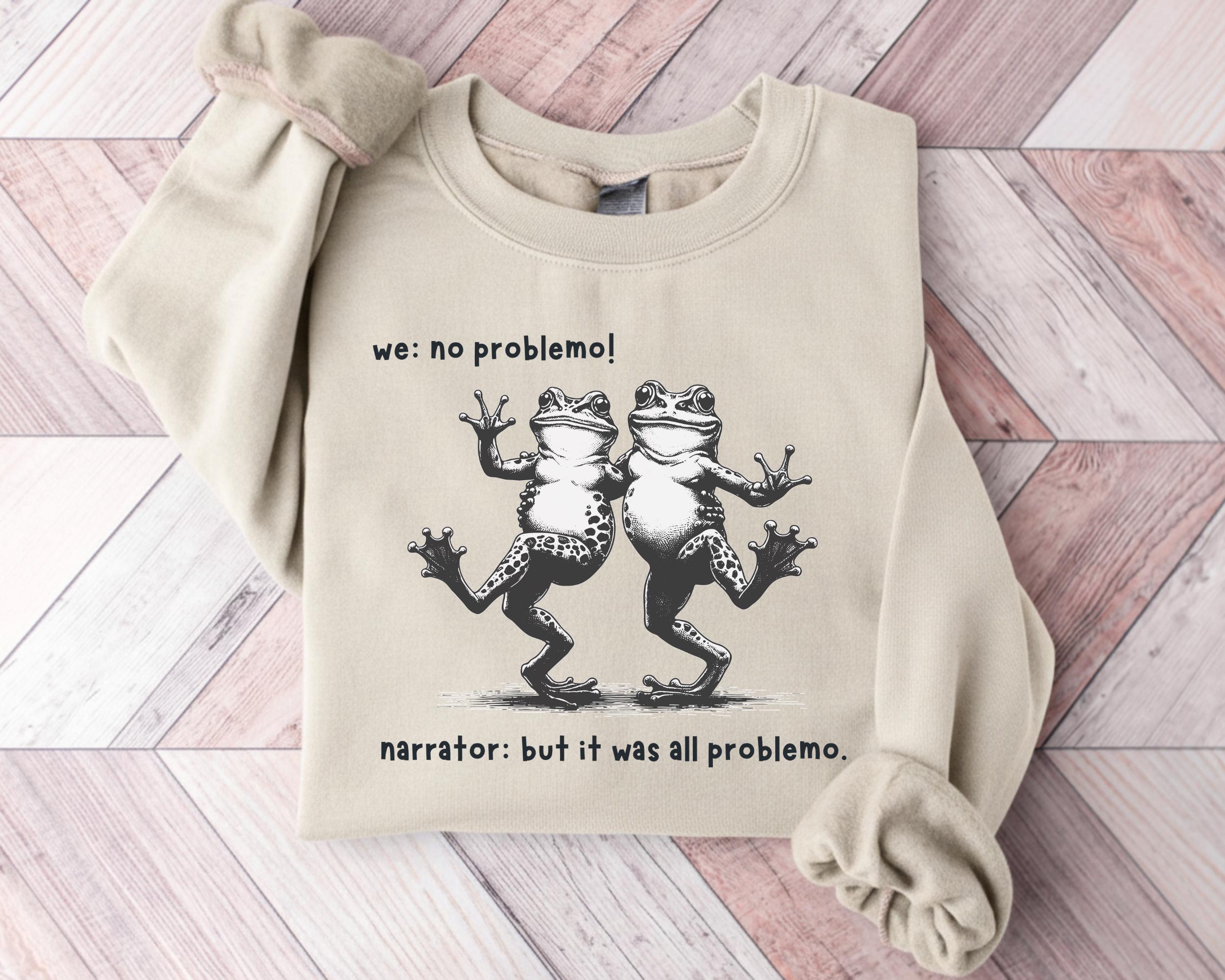 Funny Frog Narrator Sweatshirt, We: No Problemo! Meme Crewneck, Sarcastic Quote Sweater, Vintage Dancing Frogs