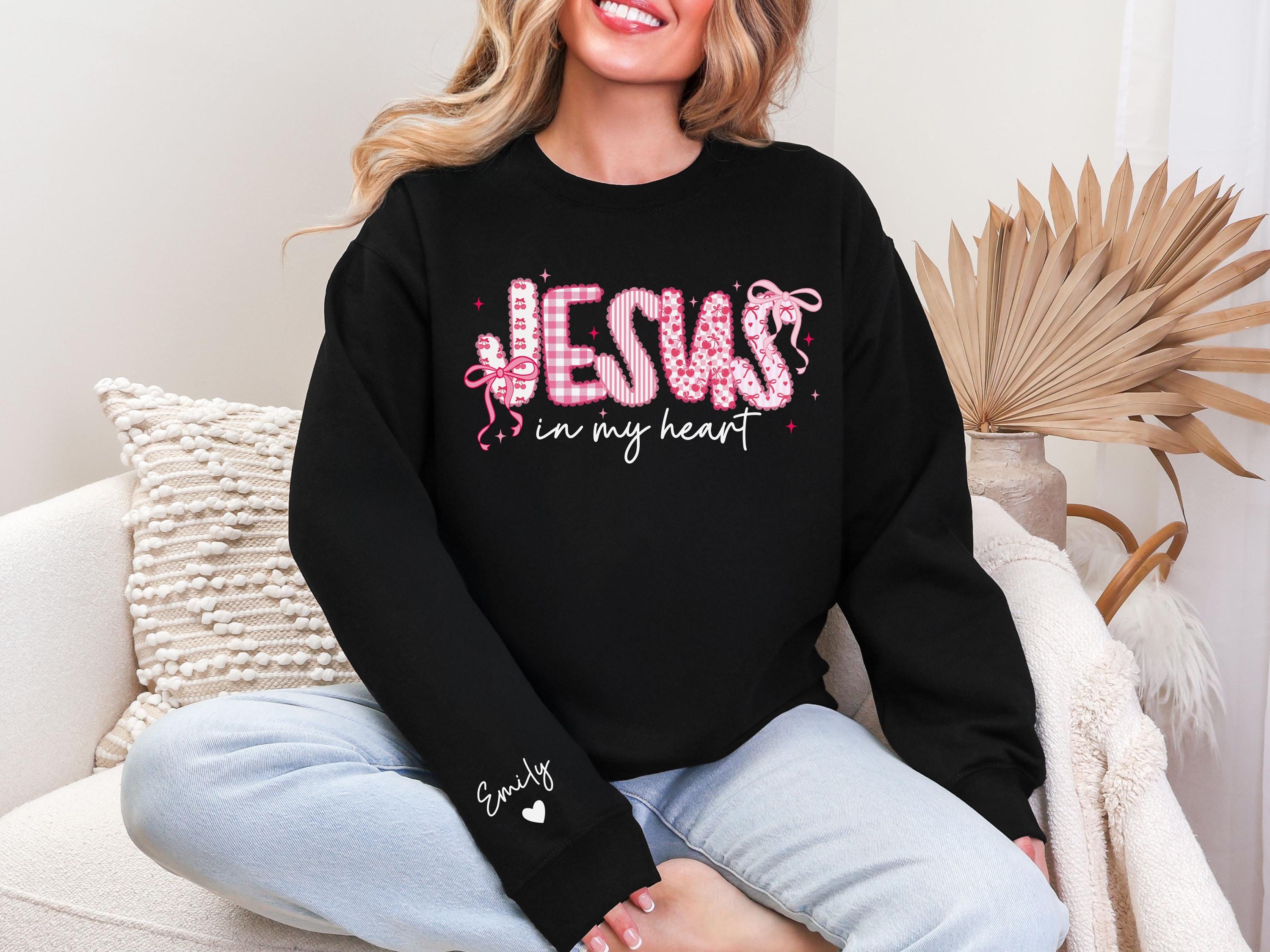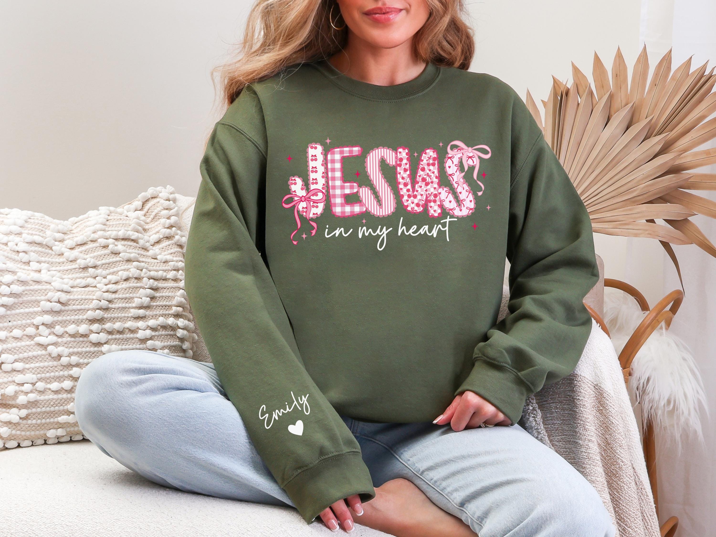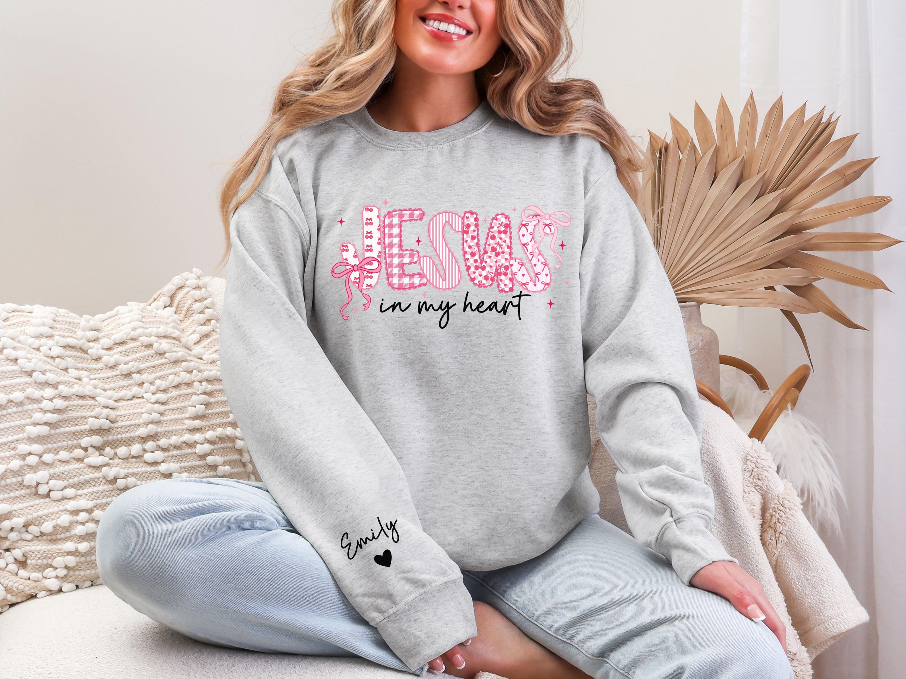 Personalized “Jesus in My Heart” Sweatshirt, Christian Sweater with Name on the Sleeve