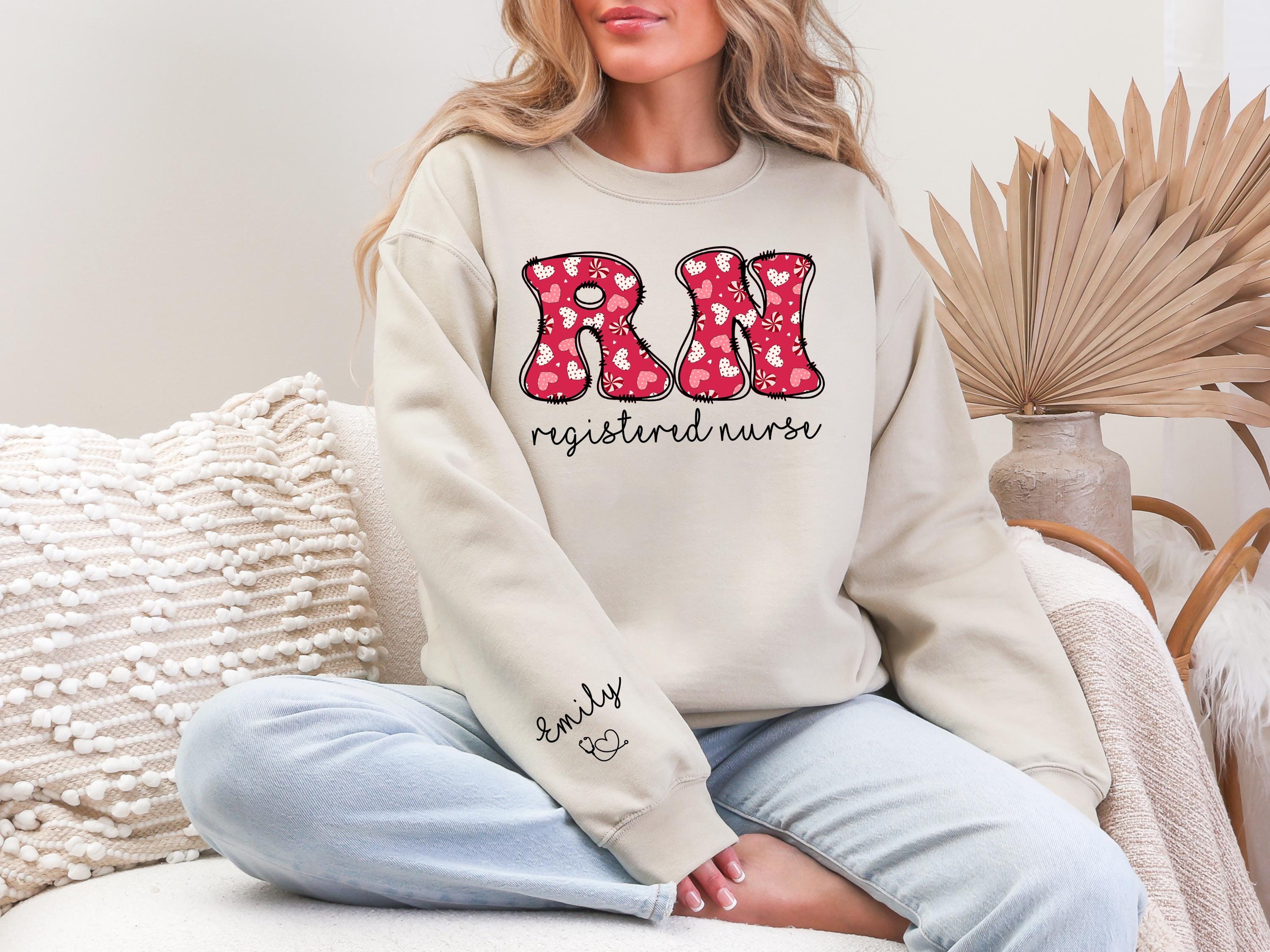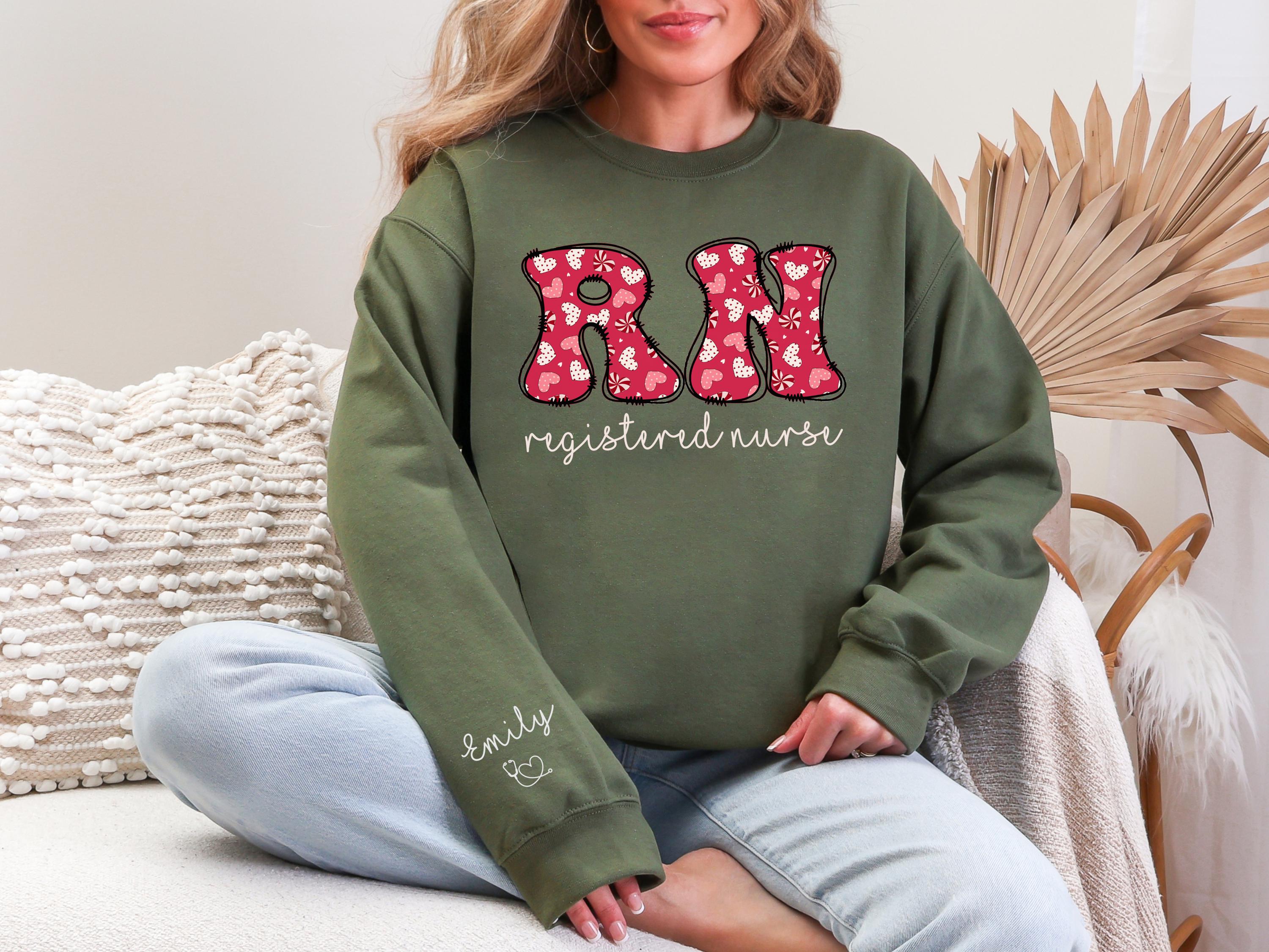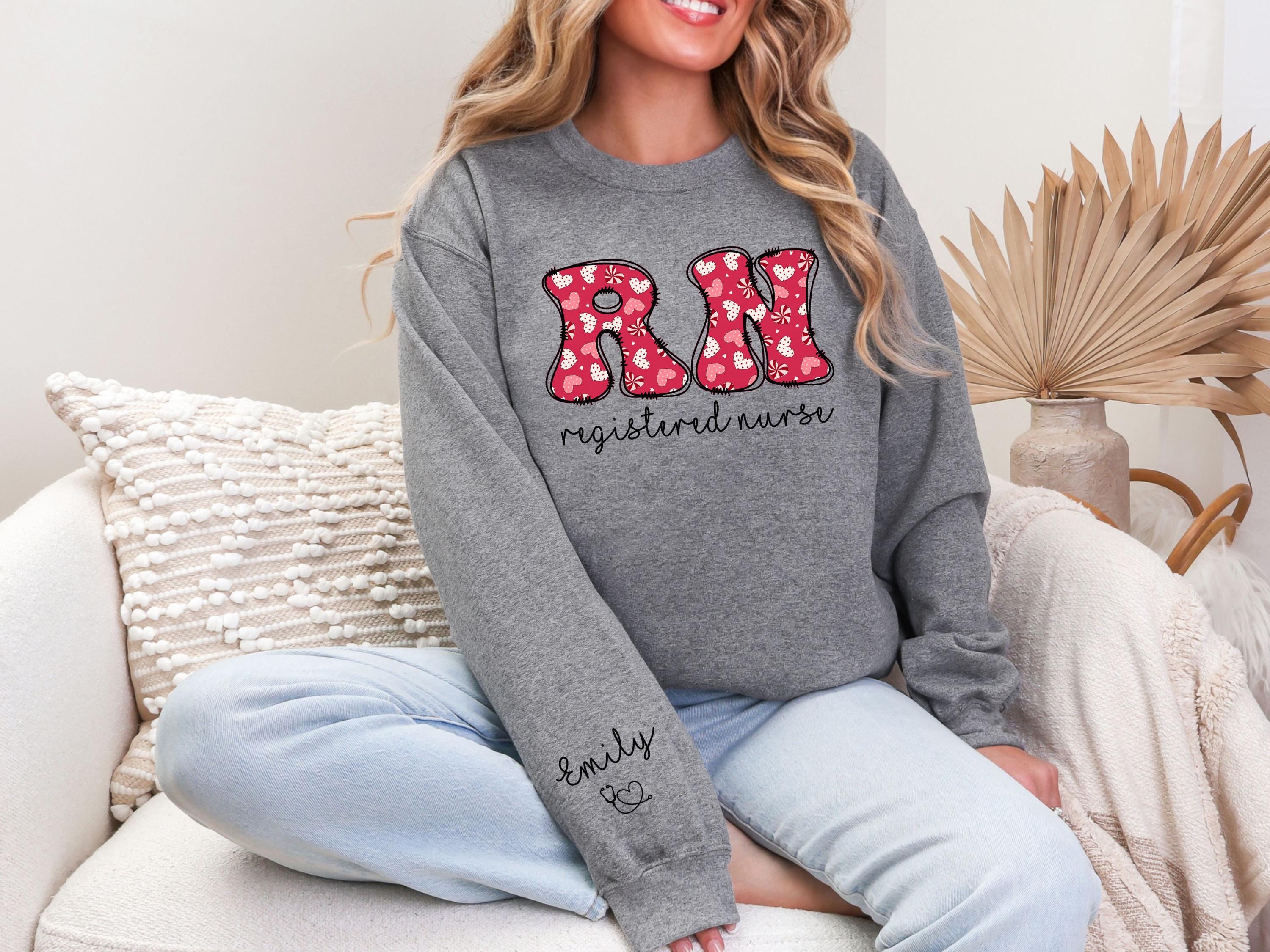 RN Sweatshirt Personalized, Registered Nurse Crewneck, Heart Pattern Nurse Gift, Custom Name Sleeve, Valentine Gift for Nurse