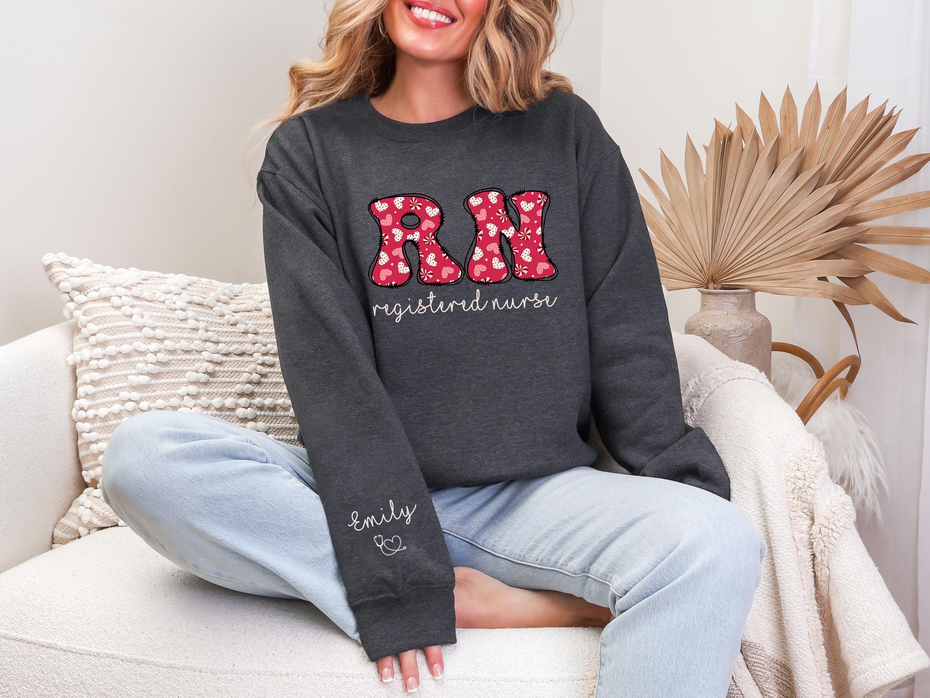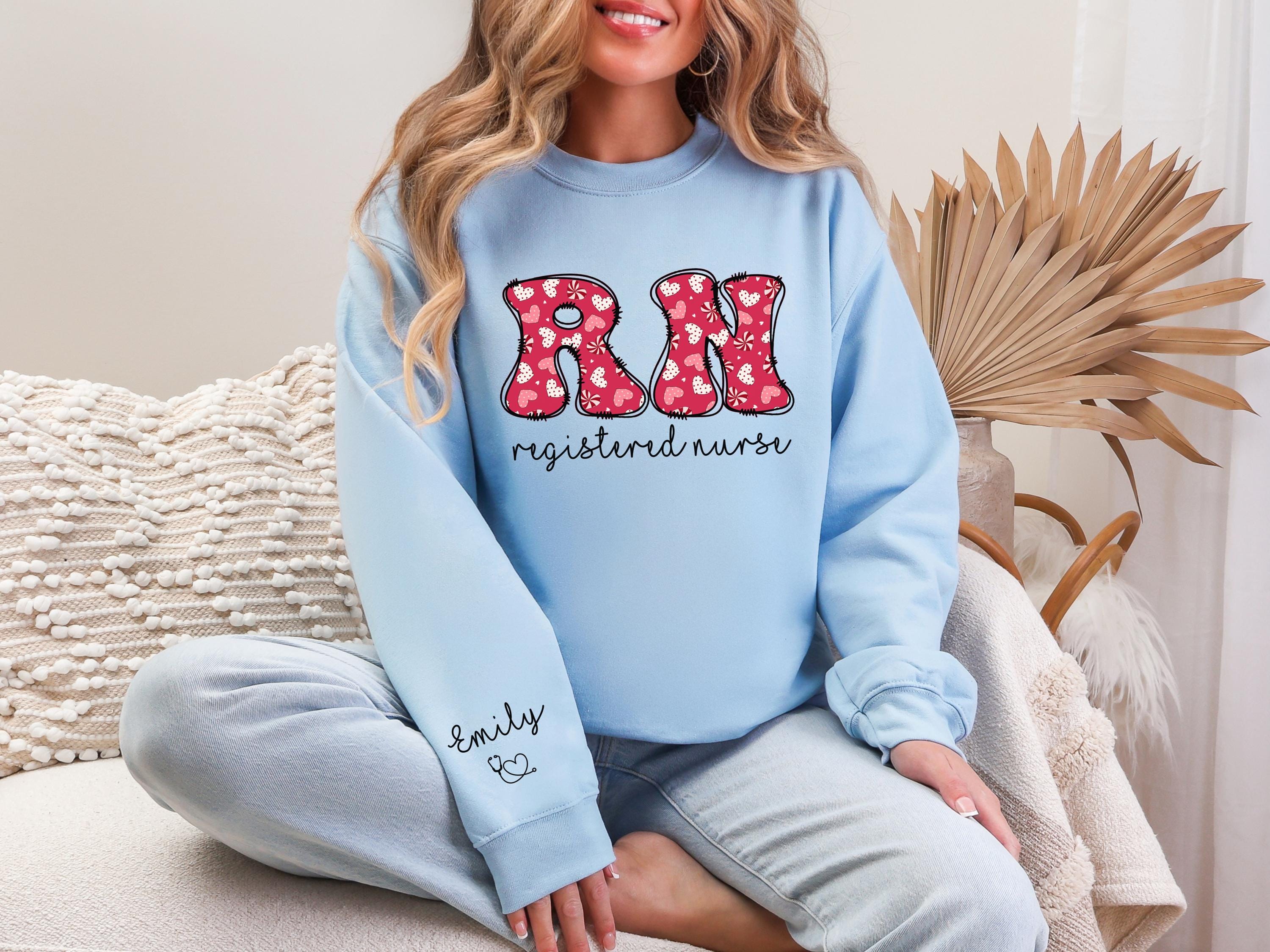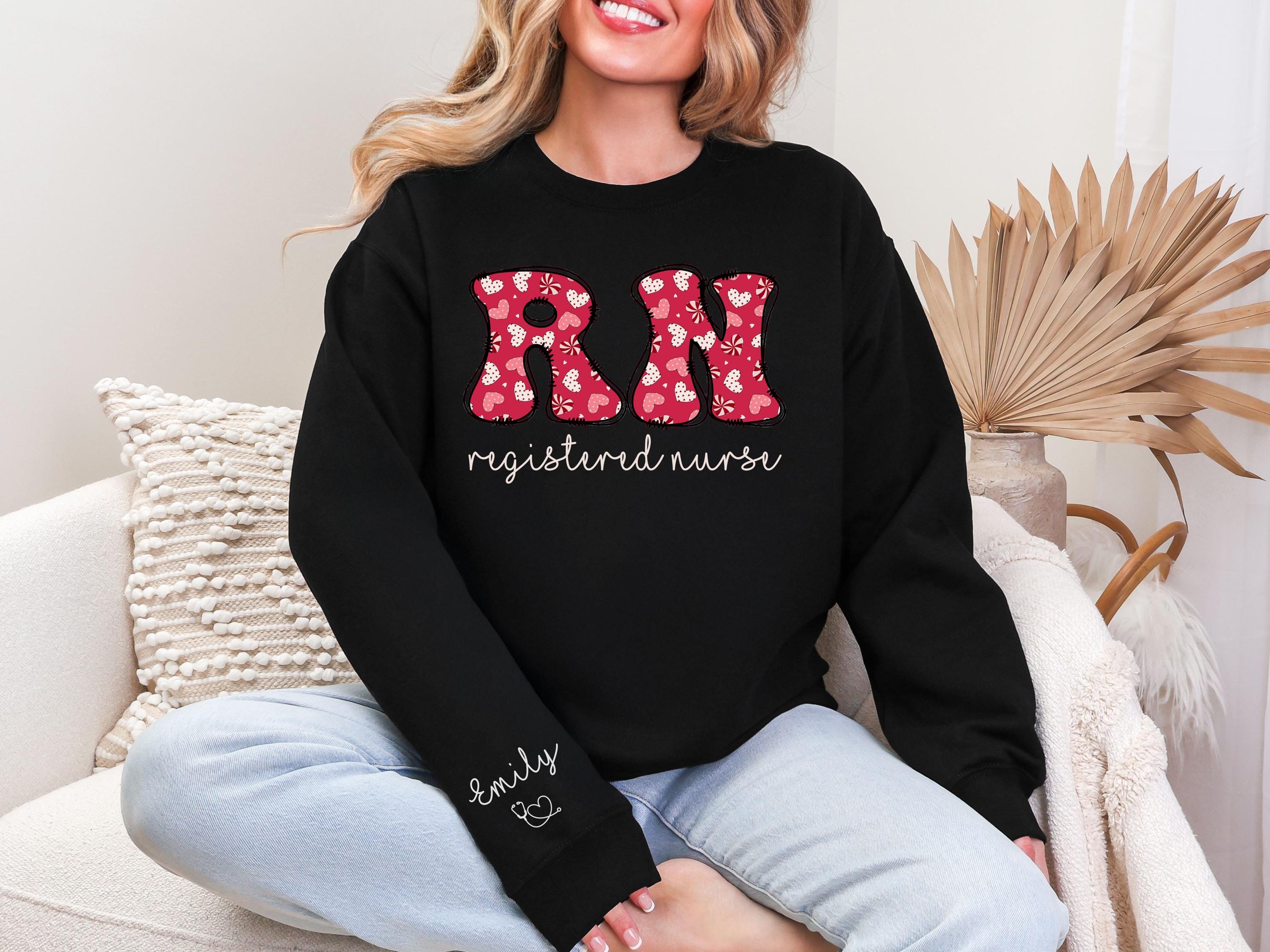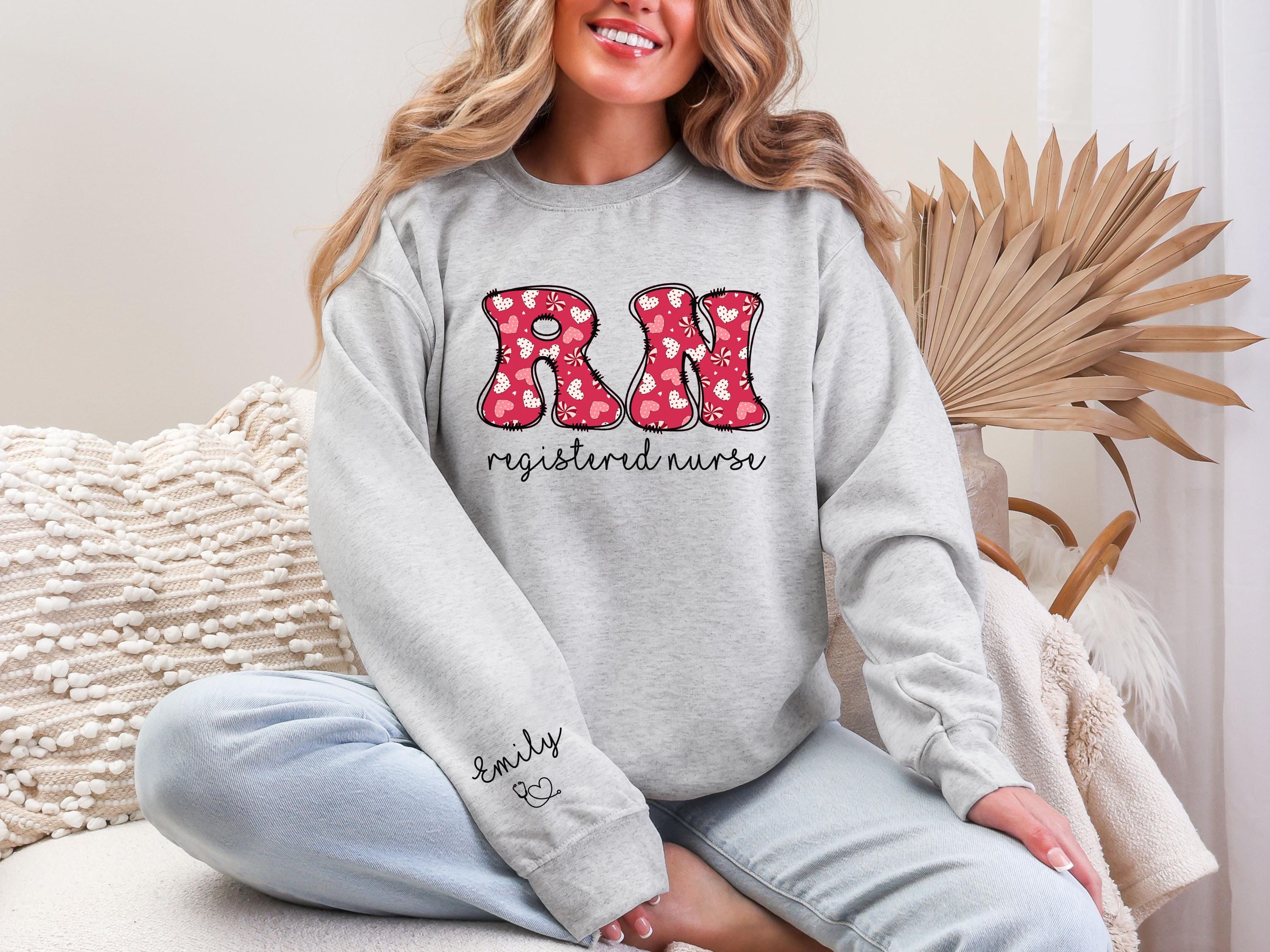 RN Sweatshirt Personalized, Registered Nurse Crewneck, Heart Pattern Nurse Gift, Custom Name Sleeve, Valentine Gift for Nurse