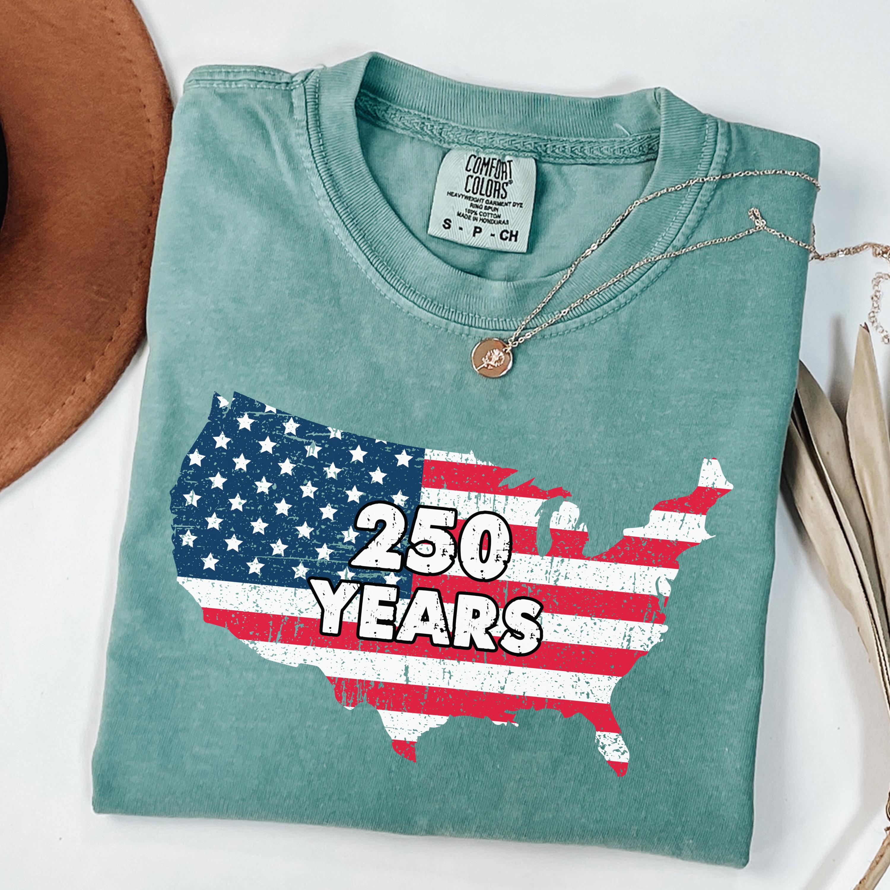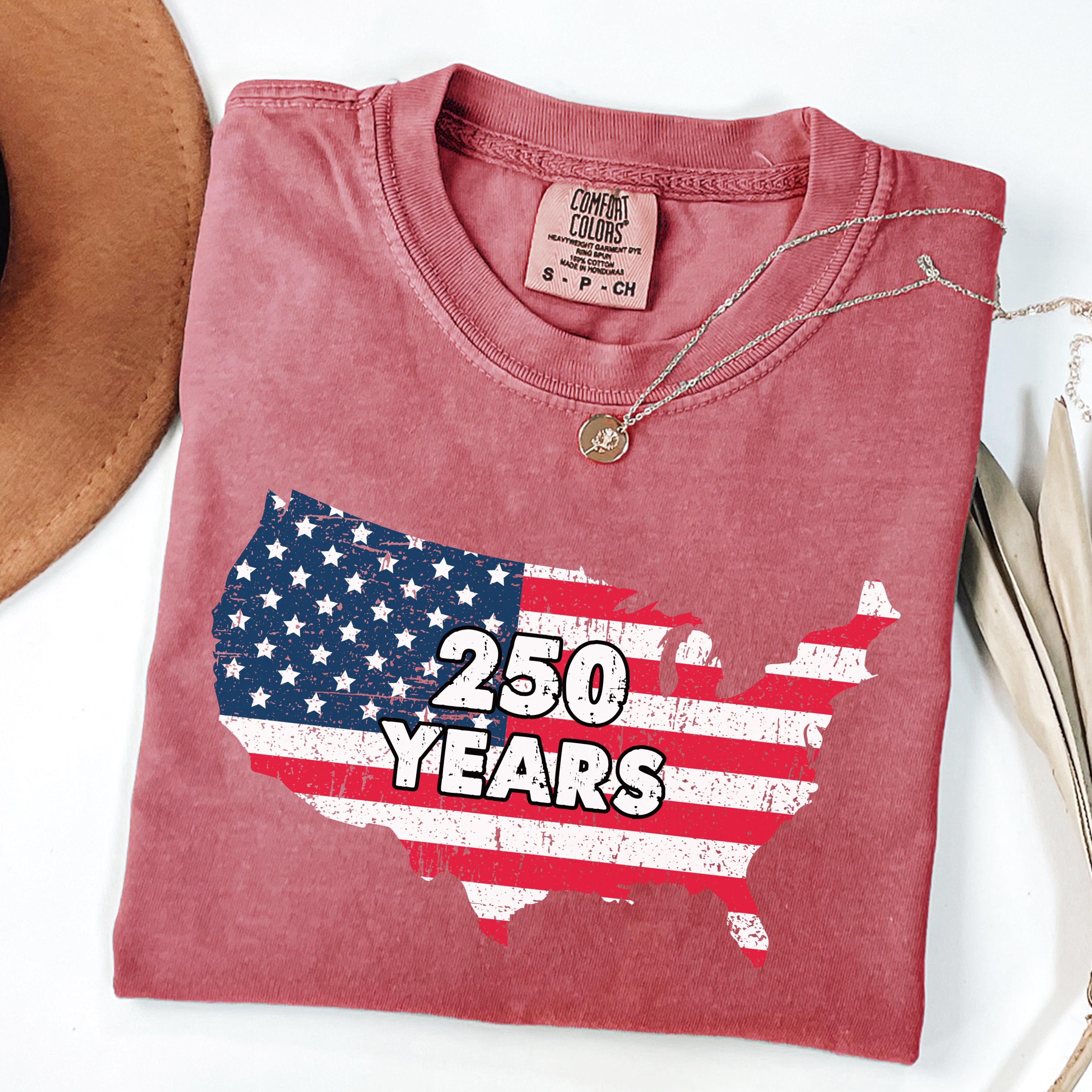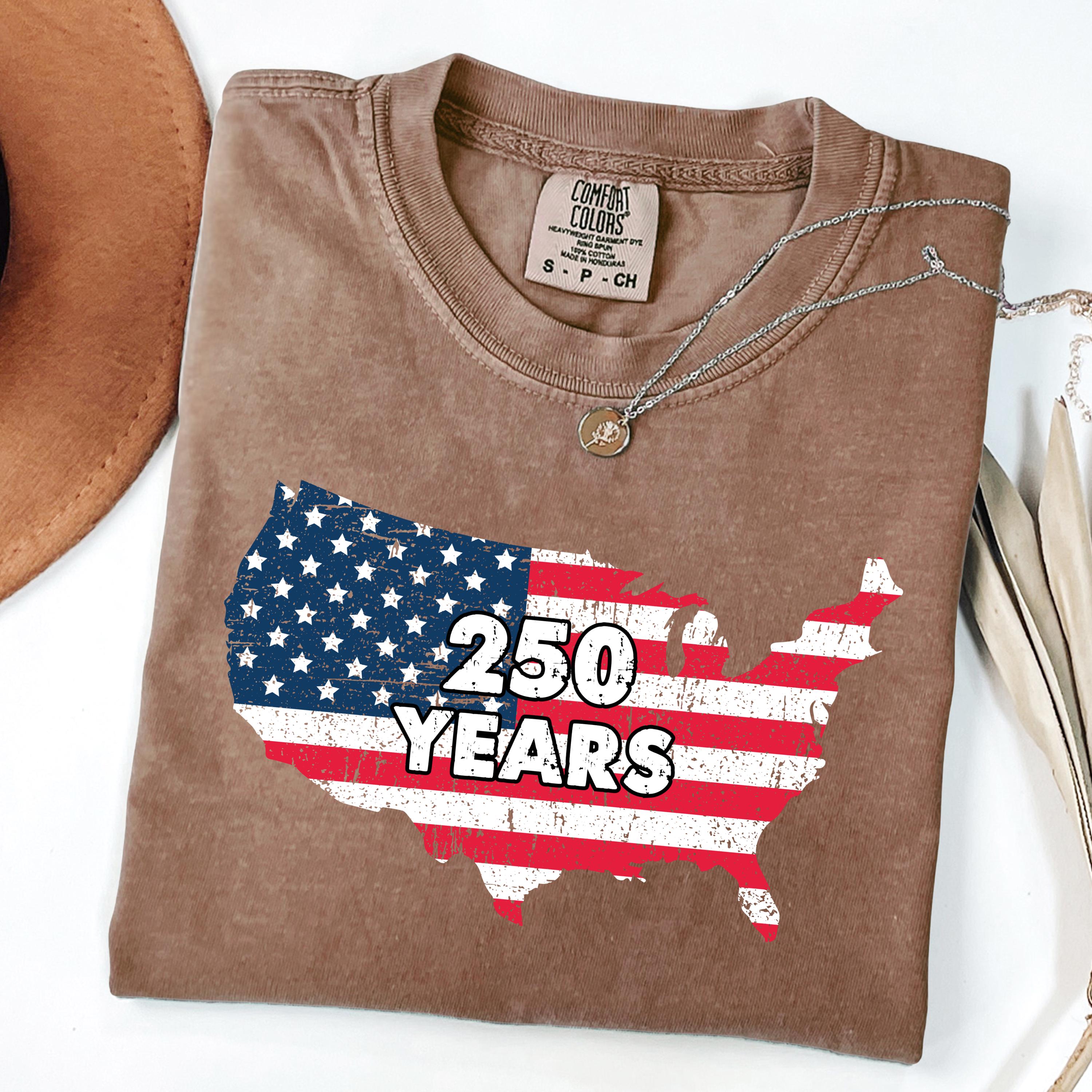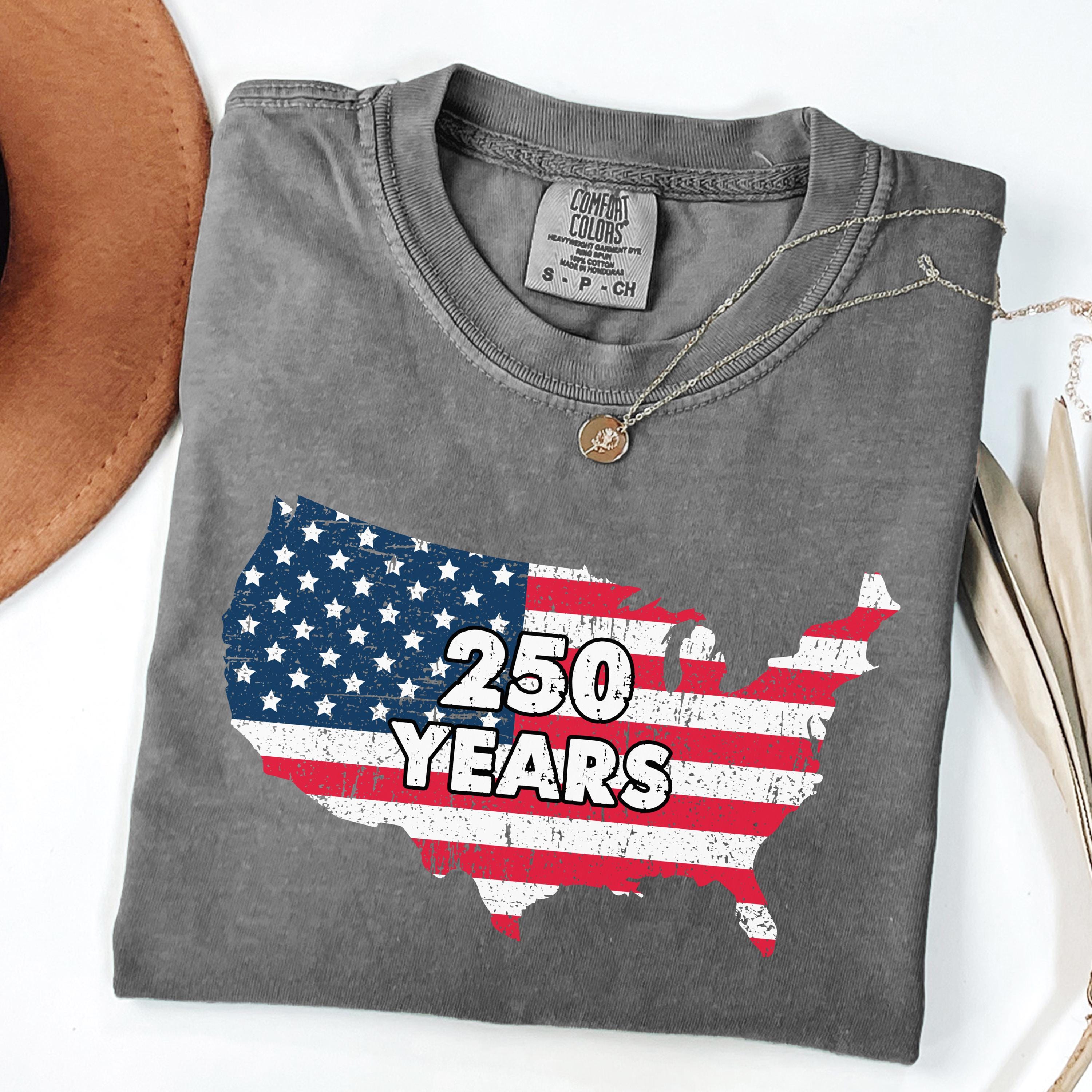 This vintage-style patriotic t-shirt features a bold United States map filled with the American flag and “250 Years” typography, making it a meaningful piece to celebrate American history and pride.